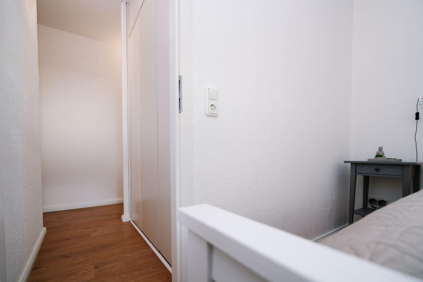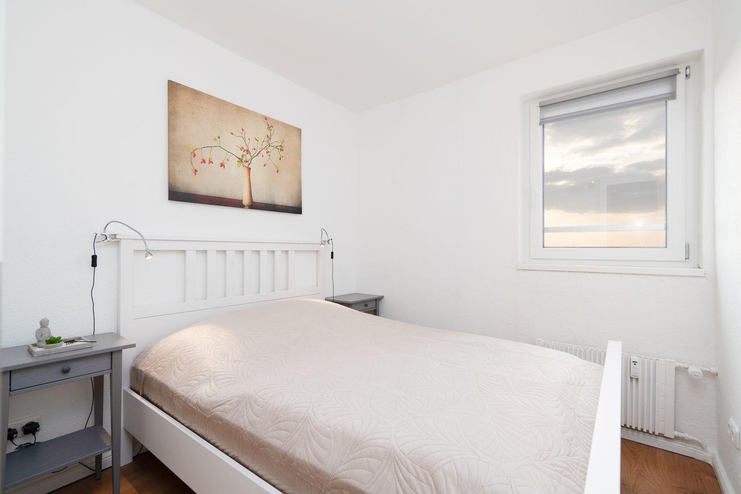 Die Ferienwohnung hat ein Schlafzimmer mit einem kleinen bequemen Doppelbett (140 cm x 200 cm). Im Wohnzimmer befindet sich eine ausziehbare Schlafcouch mit einer Liegefläche von 140 x 200 cm.
