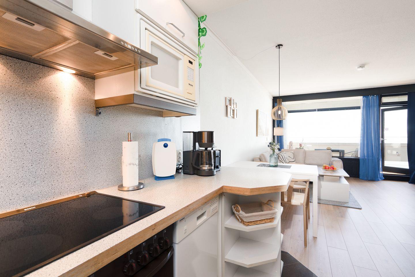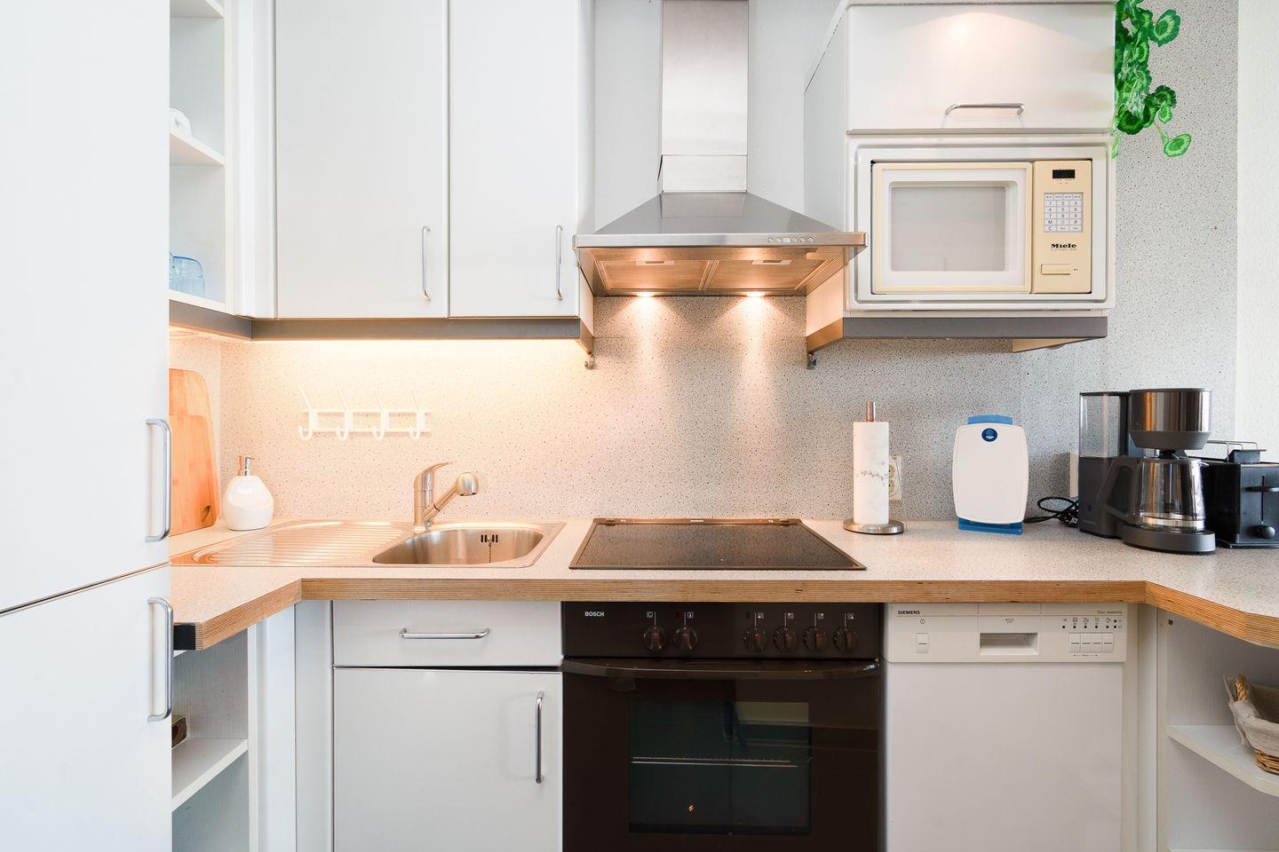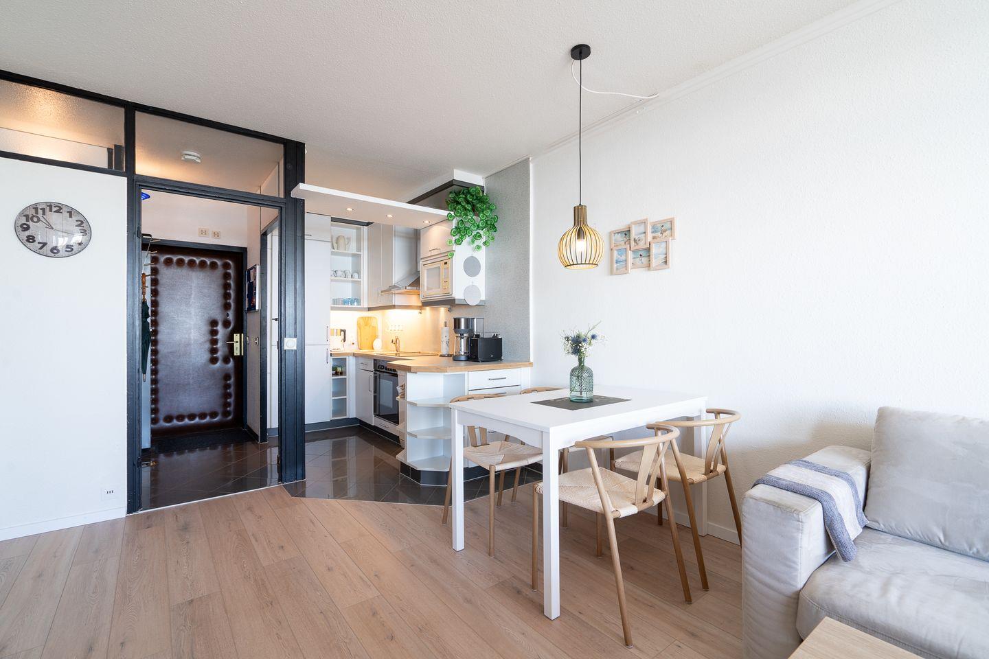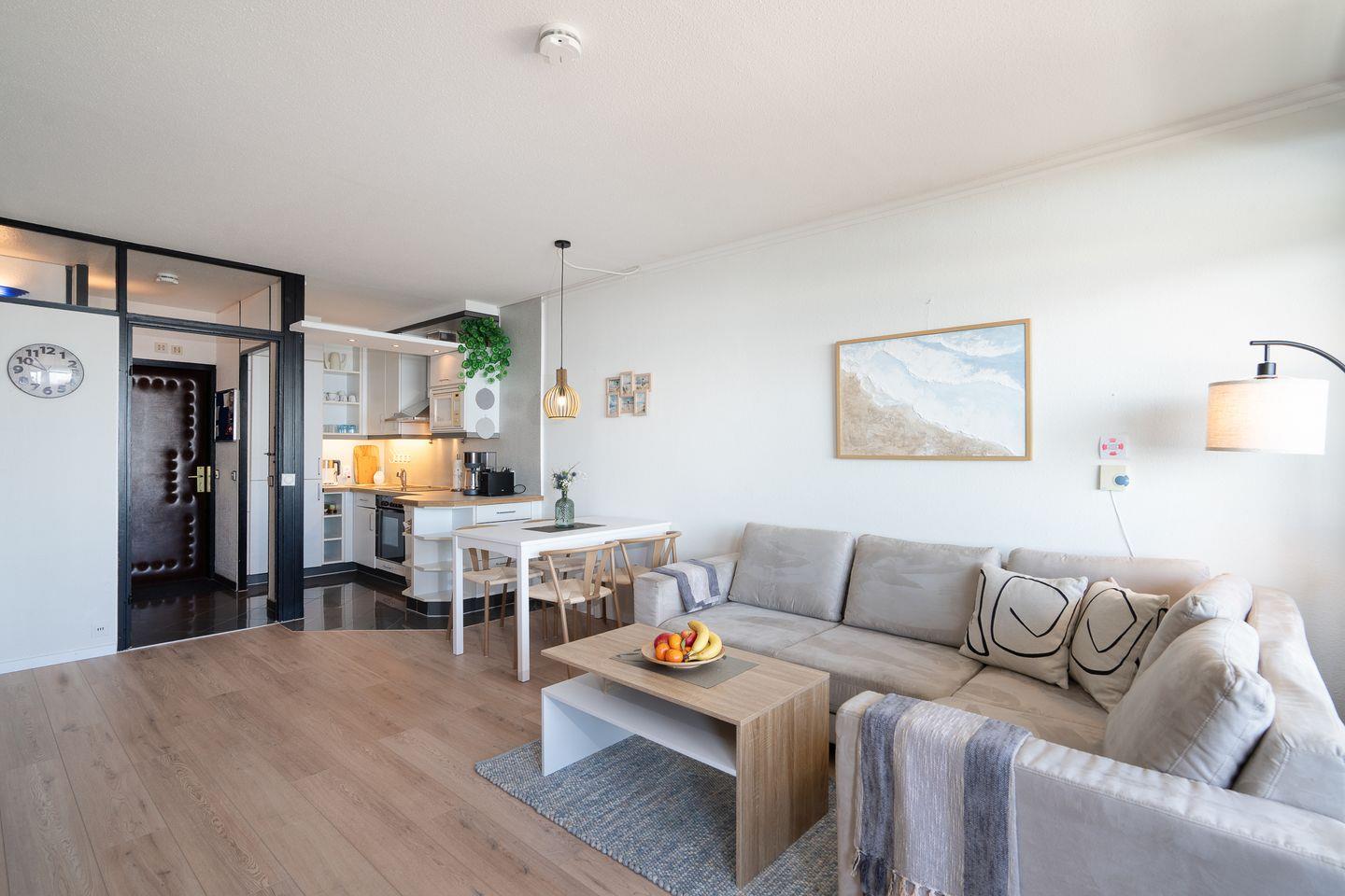 Diese Wohnung bietet Platz für bis zu vier Personen und verfügt über zwei gemütliche Schlafzimmer. Im ersten Schlafzimmer steht ein bequemes Doppelbett (200 cm, x 200 cm) im zweiten Schlafzimmer ein Etagenbett (90 cm x 200 cm). Die stilvolle Sofaecke und der einladende Essbereich im hellen, offenen Wohnbereich schaffen ein warme Atmosphäre. Ihre Mahlzeiten zubereiten können Sie in der voll ausgestatteten Küche, die mit einem Ceranfeld, Backofen, Mikrowelle, Spülmaschine und allen notwendigen Küchenutensilien ausgestattet ist. Das hell geflieste Badezimmer ist innenliegend und verfügt über eine Badewanne. Eine eigene Waschmaschine steht in der Abstellkammer.
