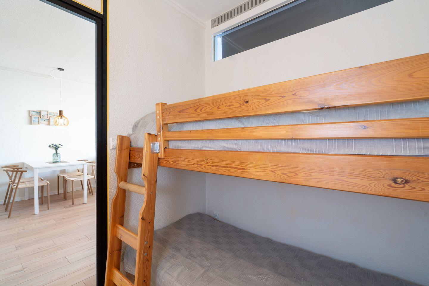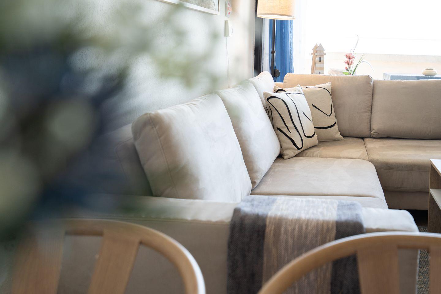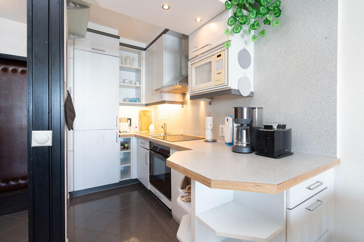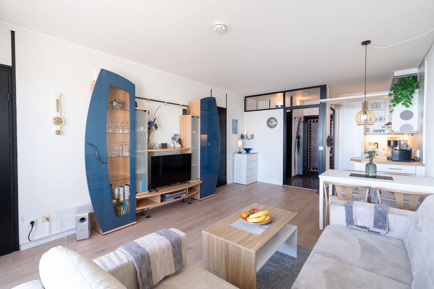 Diese Wohnung bietet Platz für bis zu vier Personen und verfügt über zwei gemütliche Schlafzimmer. Im ersten Schlafzimmer steht ein bequemes Doppelbett (200 cm, x 200 cm) im zweiten Schlafzimmer ein Etagenbett (90 cm x 200 cm). Die stilvolle Sofaecke und der einladende Essbereich im hellen, offenen Wohnbereich schaffen ein warme Atmosphäre. Ihre Mahlzeiten zubereiten können Sie in der voll ausgestatteten Küche, die mit einem Ceranfeld, Backofen, Mikrowelle, Spülmaschine und allen notwendigen Küchenutensilien ausgestattet ist. Das hell geflieste Badezimmer ist innenliegend und verfügt über eine Badewanne. Eine eigene Waschmaschine steht in der Abstellkammer.