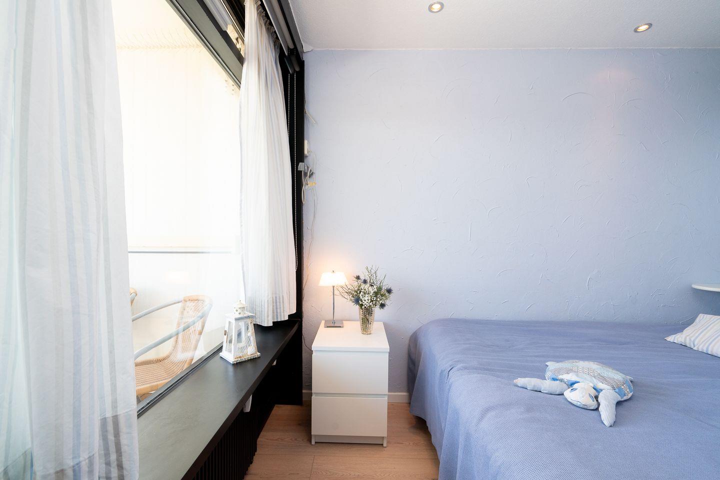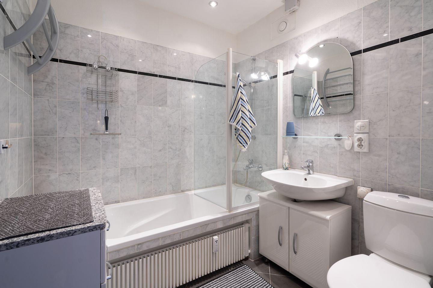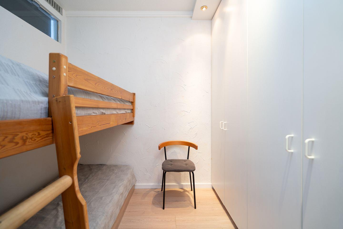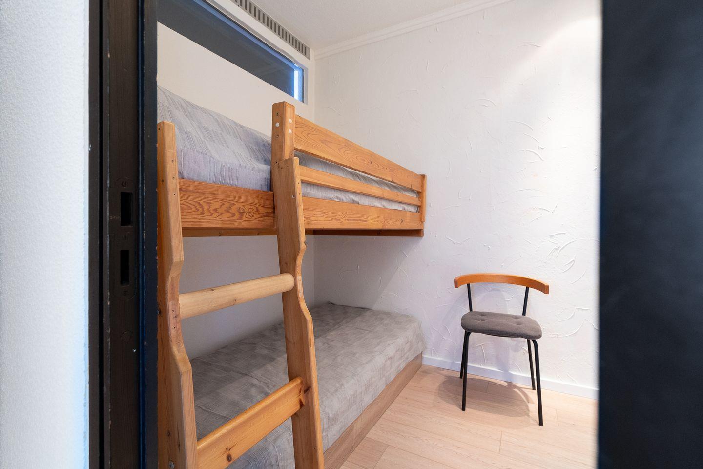 Diese Wohnung bietet Platz für bis zu vier Personen und verfügt über zwei gemütliche Schlafzimmer. Im ersten Schlafzimmer steht ein bequemes Doppelbett (200 cm, x 200 cm) im zweiten Schlafzimmer ein Etagenbett (90 cm x 200 cm). Die stilvolle Sofaecke und der einladende Essbereich im hellen, offenen Wohnbereich schaffen ein warme Atmosphäre. Ihre Mahlzeiten zubereiten können Sie in der voll ausgestatteten Küche, die mit einem Ceranfeld, Backofen, Mikrowelle, Spülmaschine und allen notwendigen Küchenutensilien ausgestattet ist. Das hell geflieste Badezimmer ist innenliegend und verfügt über eine Badewanne. Eine eigene Waschmaschine steht in der Abstellkammer.