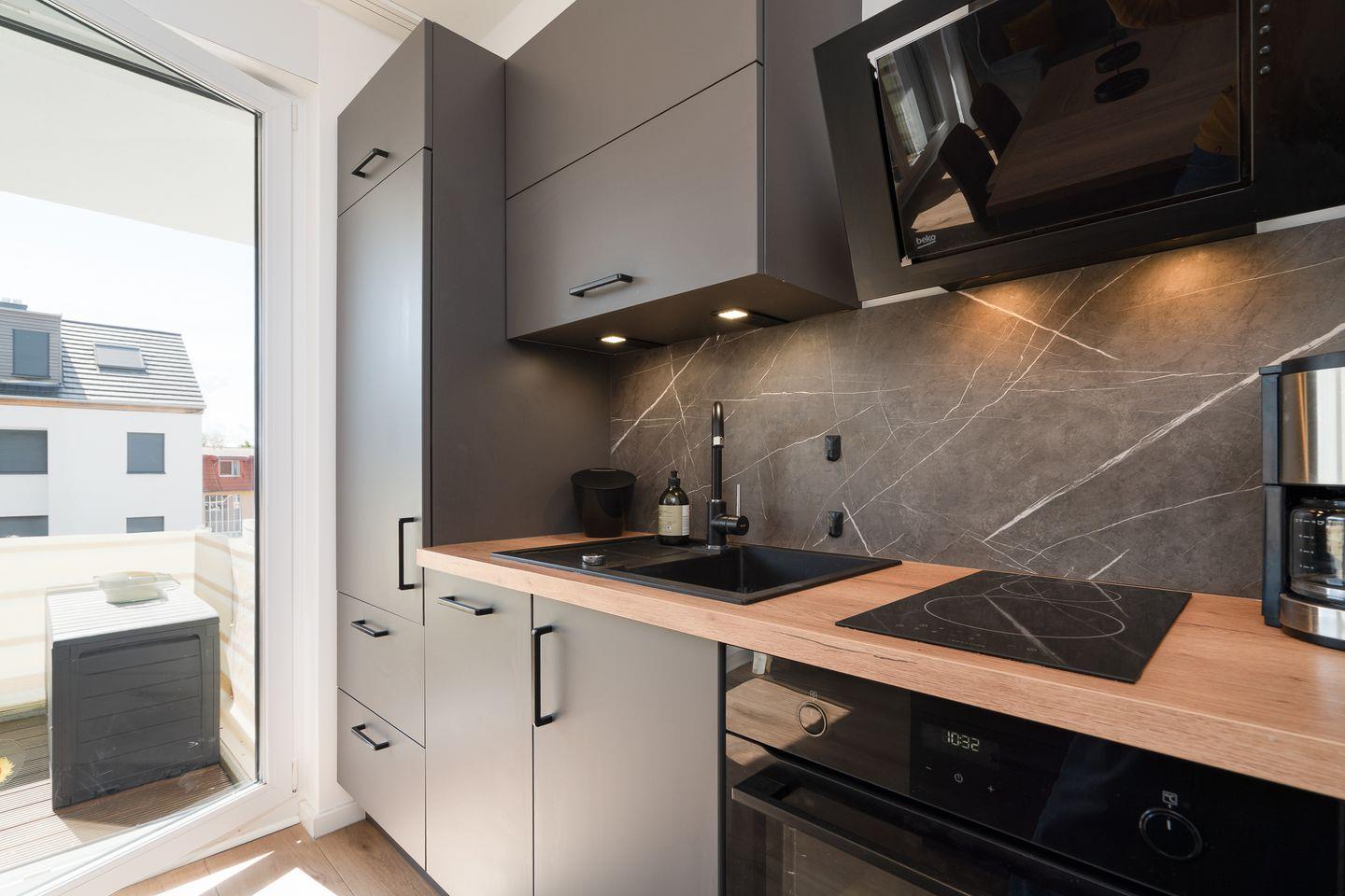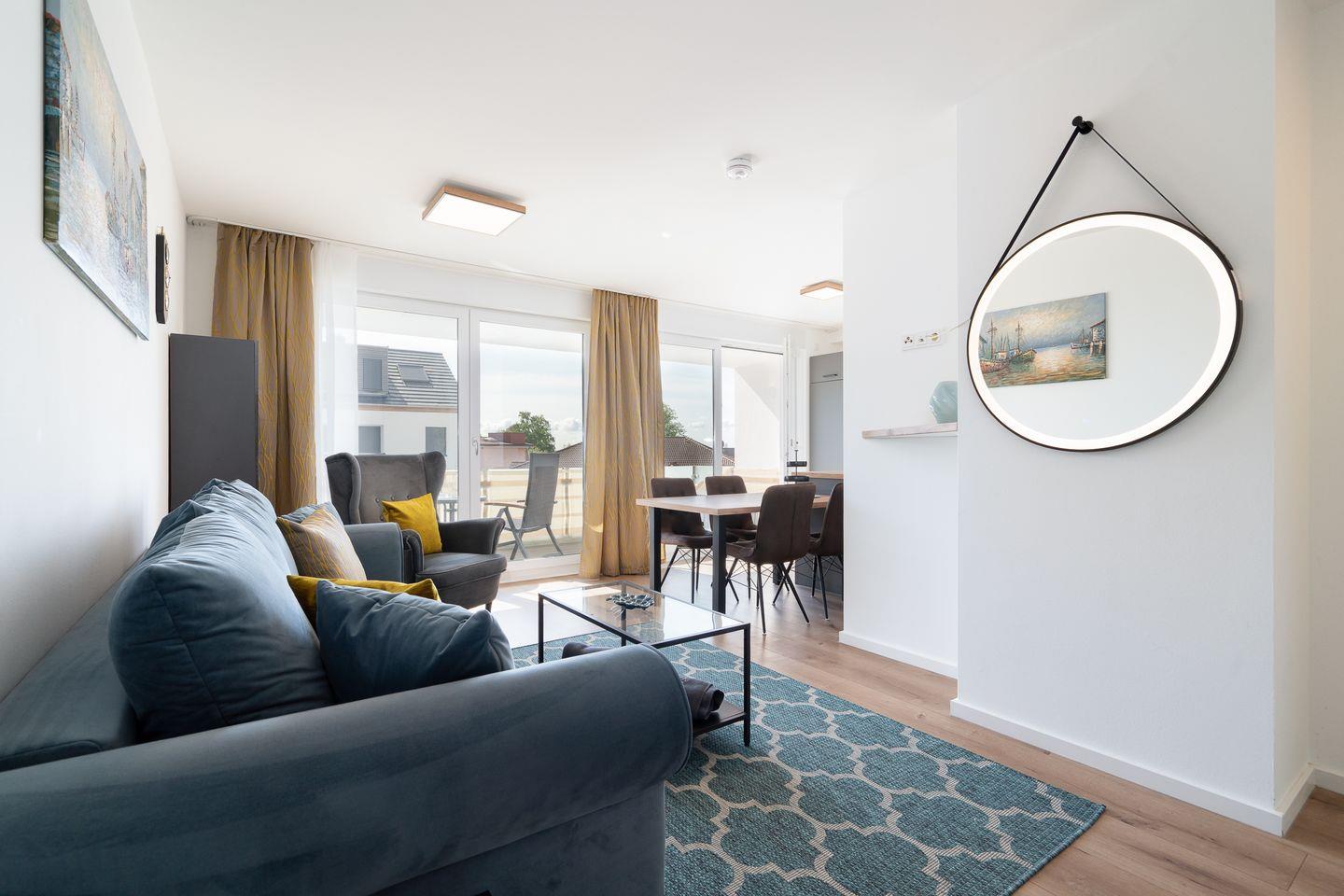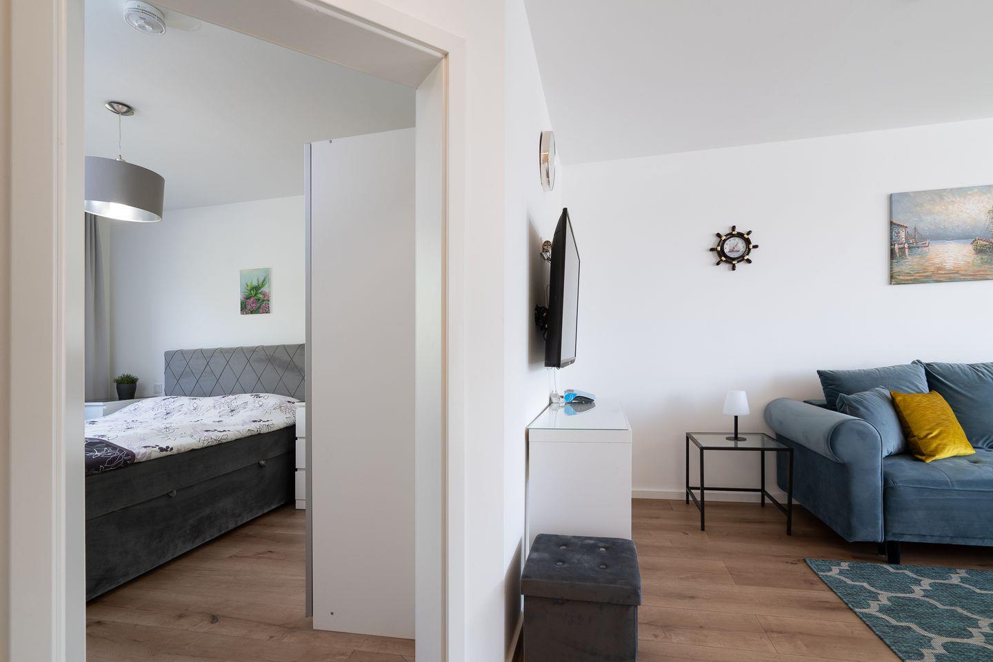 Die moderne Wohnung verfügt über einen offenen Küchenbereich, der perfekt in das Wohnzimmer integriert ist. Die Küche ist umfassend ausgestattet und an moderne Standards angepasst. Sie finden hier einen Herd, Backofen, Kühlschrank und Geschirrspüler. Für gesellige Runden steht Ihnen ein Esstisch zur Verfügung, während die Sofaecke im Wohnzimmer mit einer bequemen Sitzecke und einem Fernseher mit Zugang zu verschiedenen Programmen zum Entspannen einlädt. WLAN und ein Radio sind ebenfalls vorhanden, um sicherzustellen, dass Sie mit der Außenwelt verbunden sind oder einfach Ihre Lieblingsmusik genießen können. Im Schlafzimmer sorgt ein komfortables Boxspringbett für erholsamen Schlaf. Bitte beachten Sie, dass die Schlafzimmertür nicht ganz zu geht. Auf dem Sofa mit Schlaffunktion im Wohnzimmer ist Platz für zwei weitere Personen. Das Badezimmer ist modern gestaltet und hat eine bodengleiche Dusche, ein Waschbecken, ein WC, sowie einen Haartrockner.