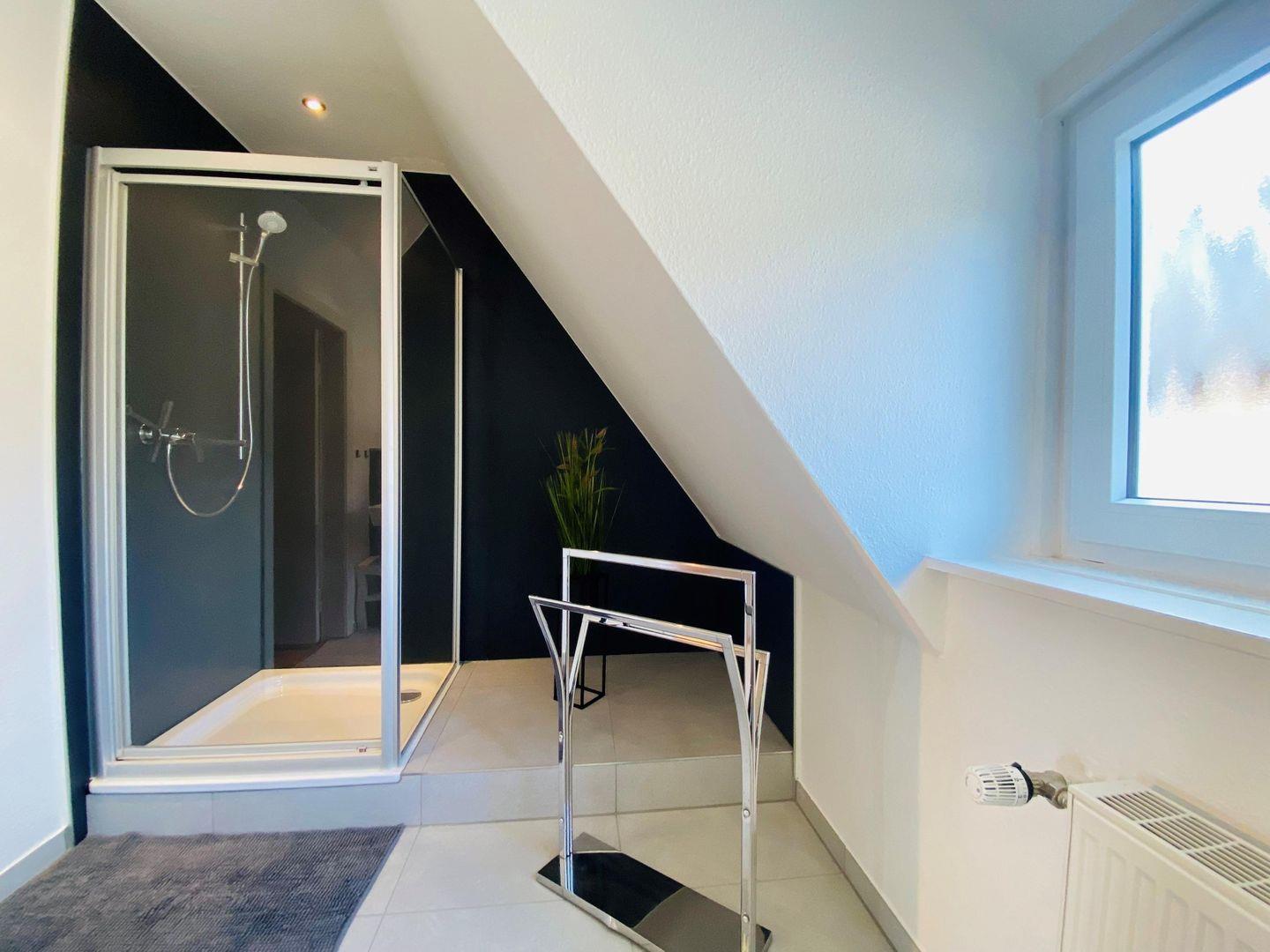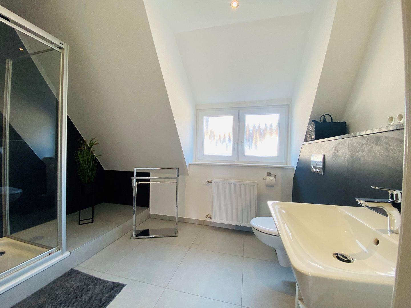 Das moderne Badezimmer überzeugt mit bodengleicher Dusche, Handwaschbecken, WC, Kosmetikspiegel, Haartrockner und 2 Fenstern. Zusätzlich gibt es ein separates Gäste-WC. Alle Fenster verfügen über Sichtschutz zum angenehmen Wohnen.