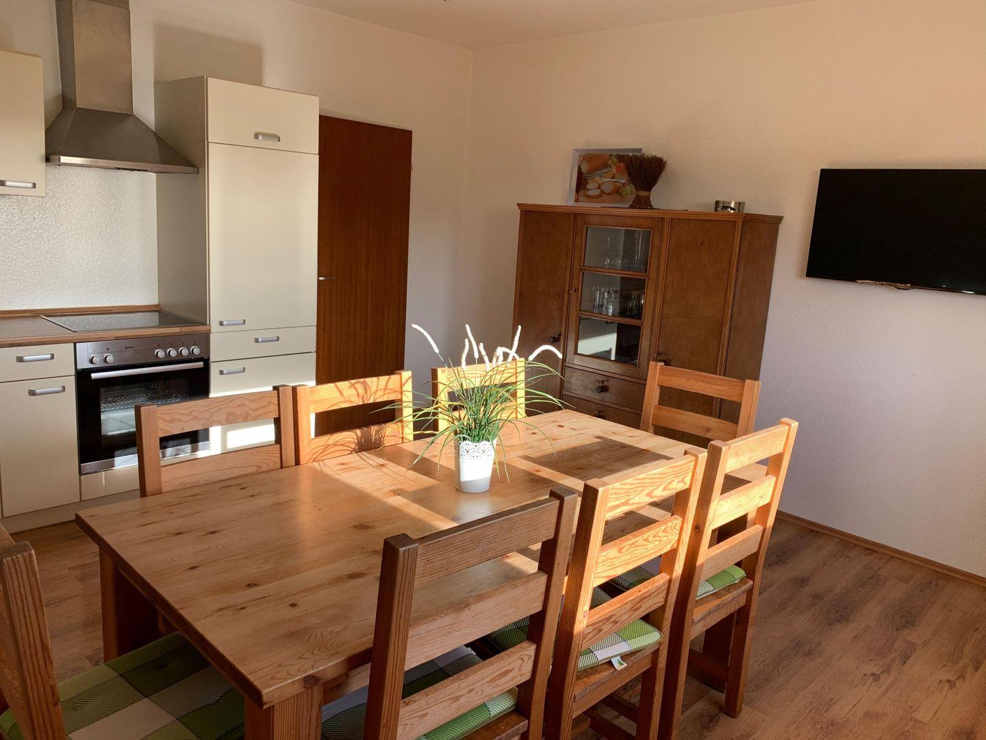 Das lichtdurchflutete Wohnzimmer mit Laminatboden, bequemer Sofaecke, Sesseln und einem Satelliten-TV ( 2. TV-Gerät in der Küche) lädt zum Entspannen ein. Das Esszimmer ist direkt in der Küche integriert und bietet ausreichend Platz für geselliges Beisammensein. Die geschlossene Küche ist komplett ausgestattet: Cerankochfeld, Elektro-Backofen, Kühlschrank mit Gefrierfach, Spülmaschine, Kaffeemaschine, Toaster, Wasserkocher sowie sämtliches Geschirr und Küchenutensilien stehen bereit. Mit dem zur Ausstattung gehörenden Wäscheständer und Staubsauger ist auch an praktischen Komfort gedacht.