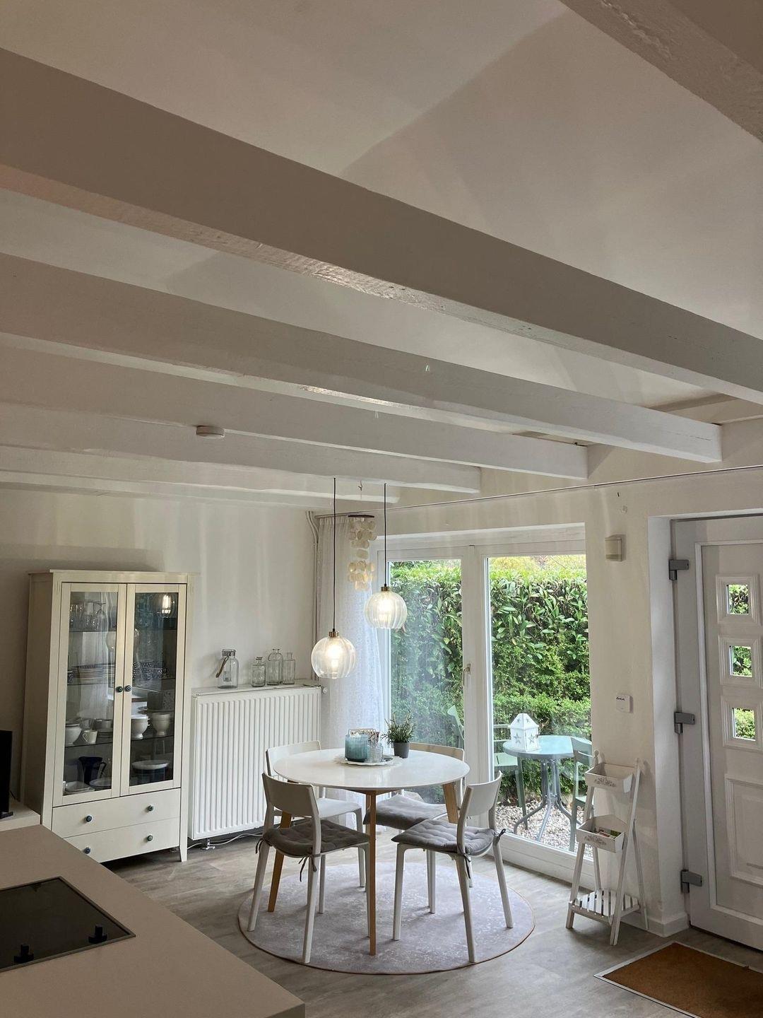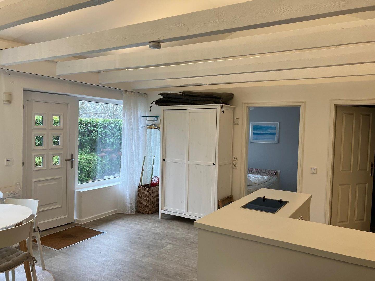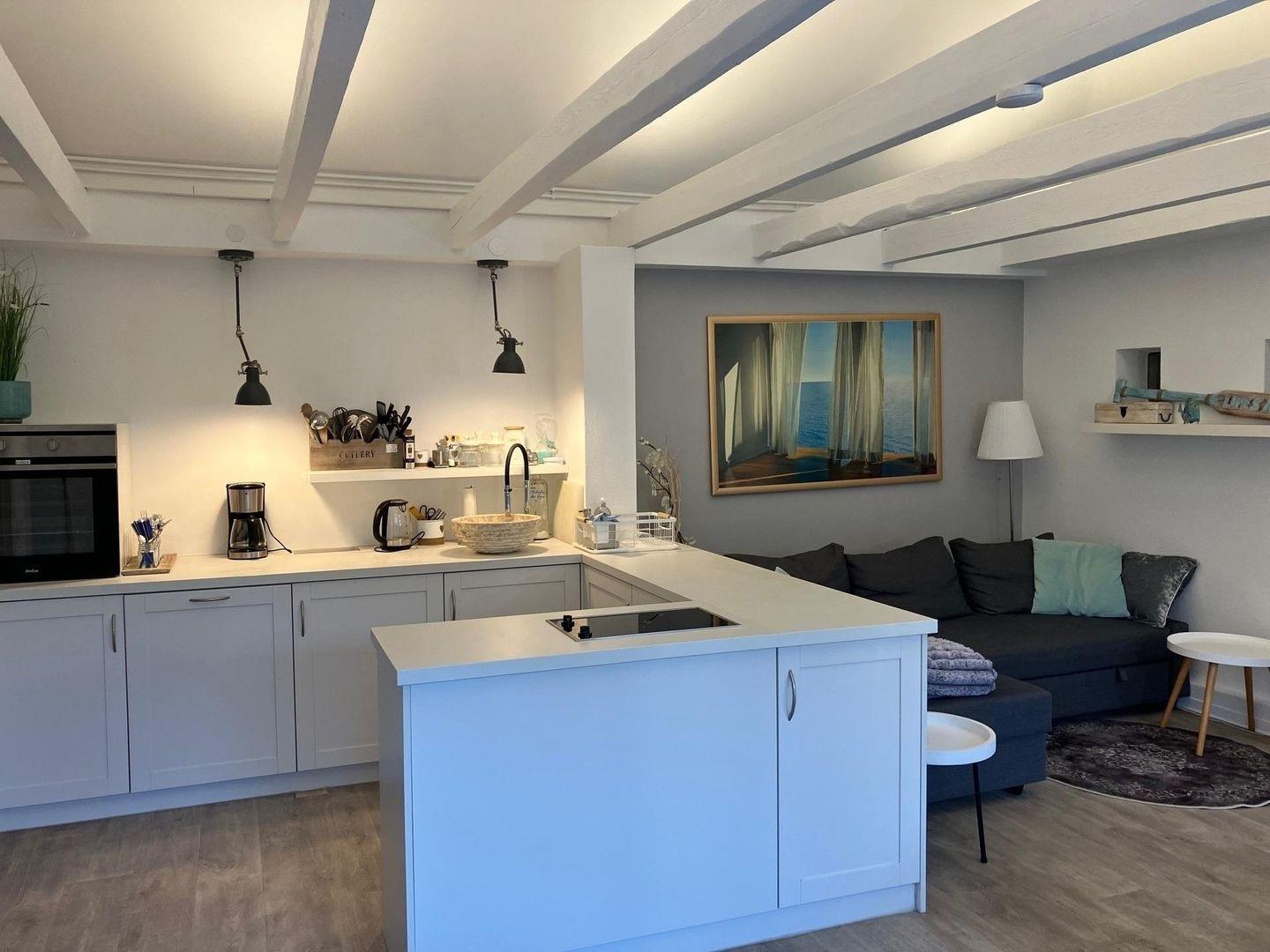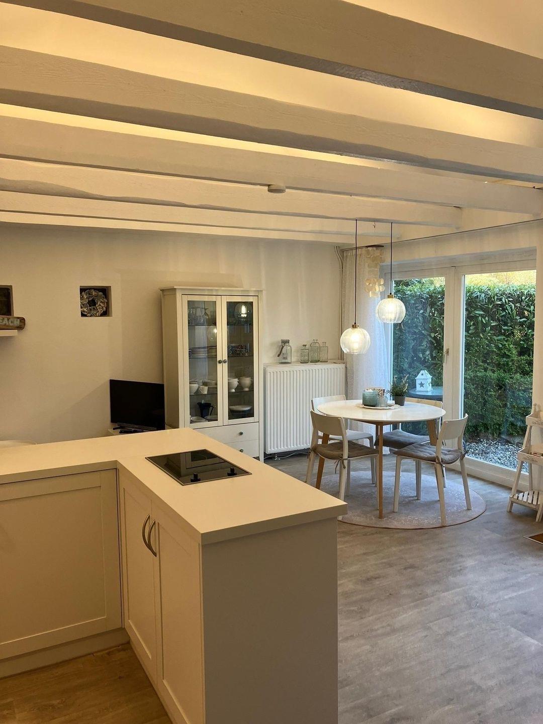 Das kleine Häuschen am Meer verfügt über ein neues Schlafzimmer (neue Matratze mit Topper) und eine neue offene Küchenzeile (Ende 2022) übergehend in den Ess- und Wohnbereich. Die kleine Küchenzeile verfügt über einen Geschirrspüler, Kühlschrank mit Gefrierfach und einen Backofen.