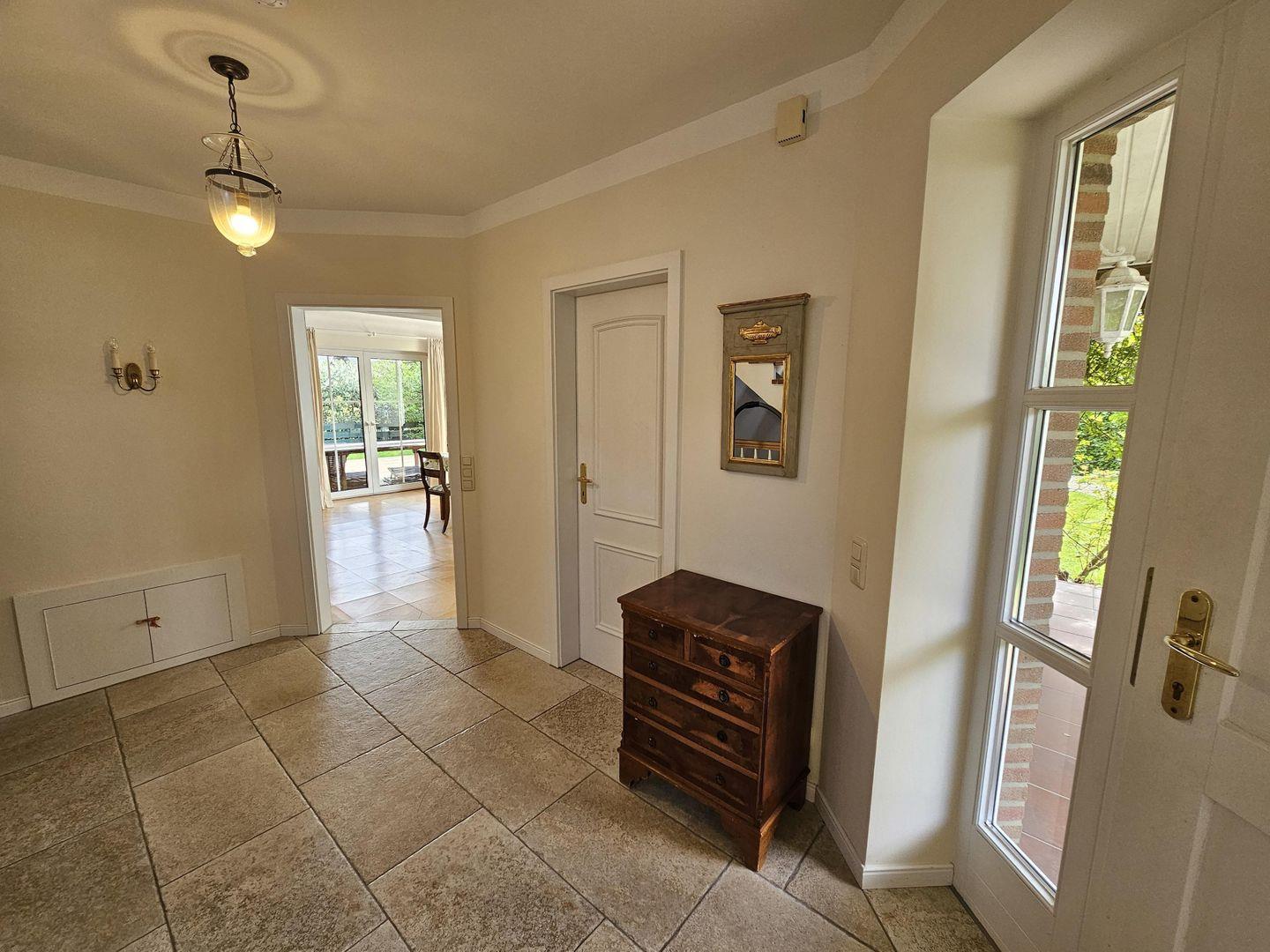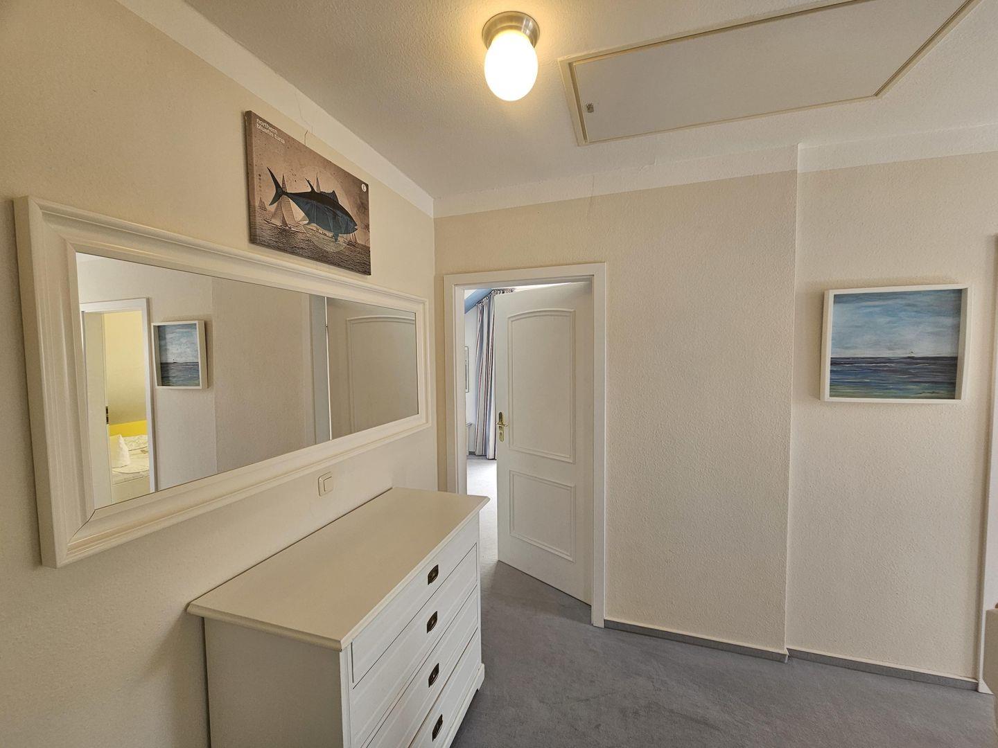 Treten Sie ein in dieses schöne Ferienhaus: ein großer Flur mit Garderobe und Platz zum Ankommen erwartet Sie: vom Flur aus erreichen Sie die Küche gleich zur rechten Hand, das großzügige Wohn- und Esszimmer, sowie das untere hellblaue Schlafzimmer mit einem Einzelbett (2,00 x 1,40 m) und ein Gäste WC mit Dusche.