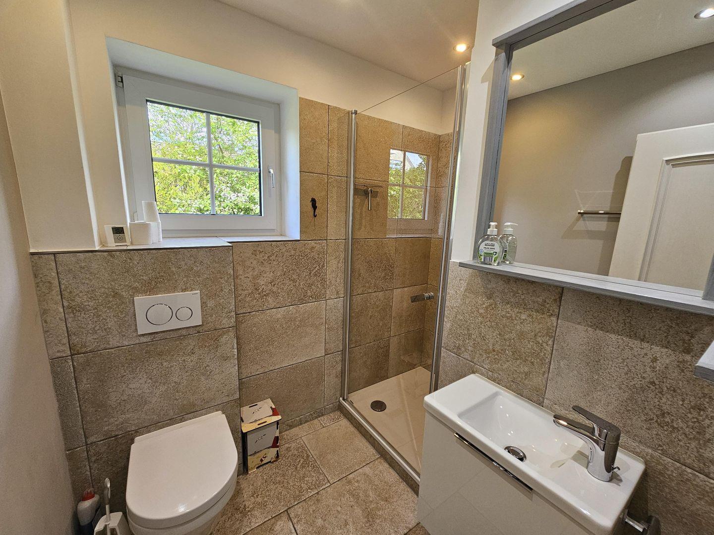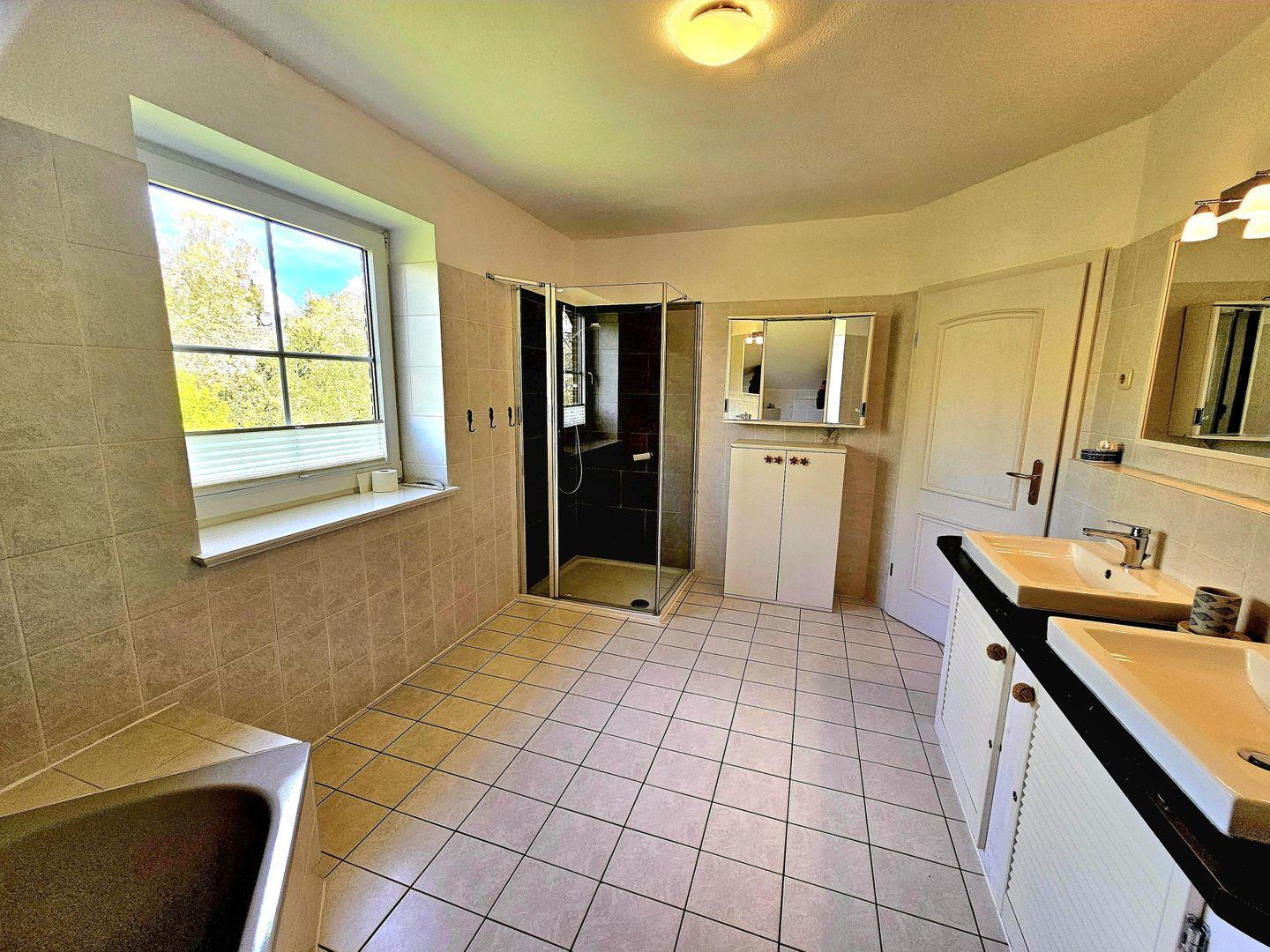 Das große Badezimmer mit Badewanne und Dusche ist ebenfalls im Obergeschoss untergebracht.