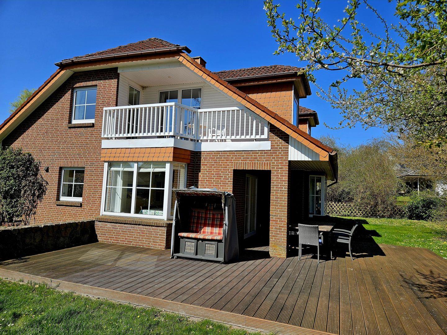 Vom Wohnraum gelangen Sie auf die Terrasse, welche mit Gartenstühlen möbliert ist und in den Sommermonaten mit einem Strandkorb.