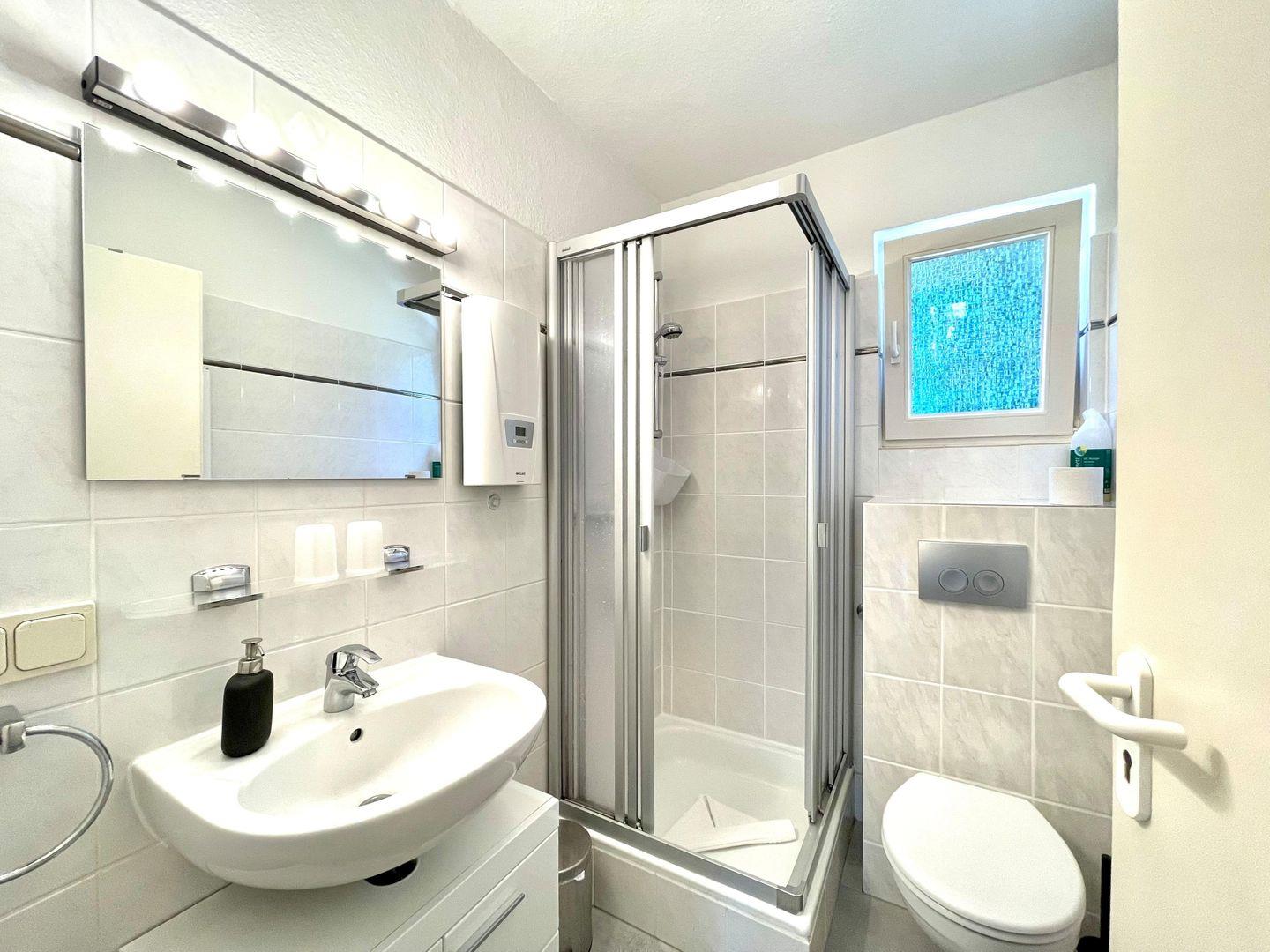 Im Badezimmer finden Sie eine Dusche und einen Haartrockner. Zu der Ferienwohnung gehört auch ein PKW - Stellplatz.