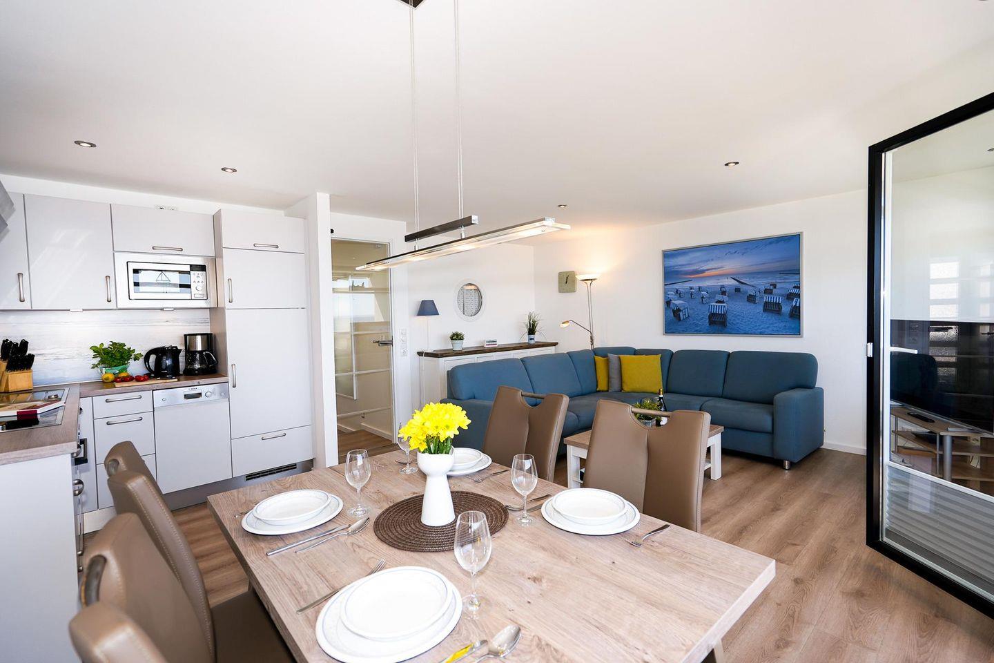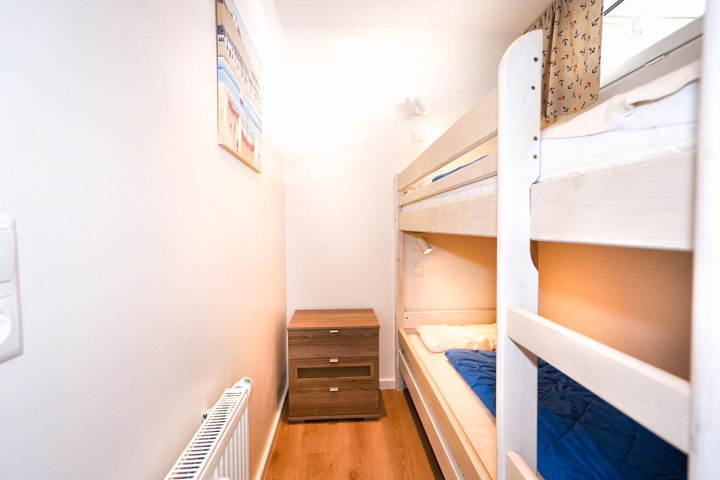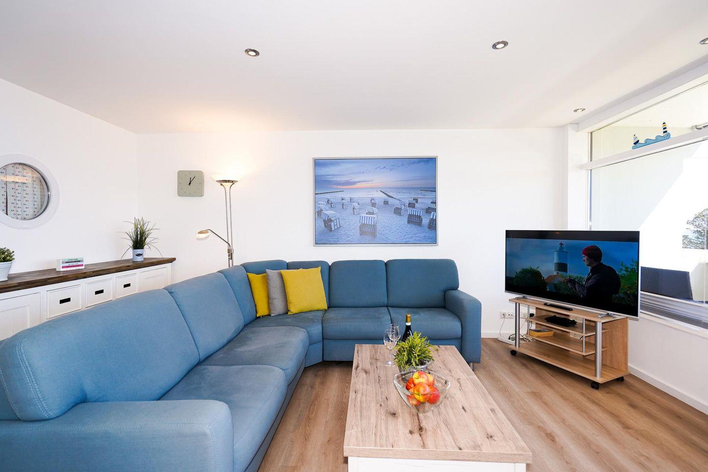 Das kürzlich renovierte Ferienapartment hat eine Wohnfläche von etwa 50 Quadratmetern. Von dem mit wetterfesten Möbeln eingerichteten Balkon und vom Wohnzimmer aus gewährt Ihnen die Wohnung einen Traumblick auf die Ostsee. Die komplett ausgestattete Küche enthält alle Geräte und Kochutensilien, um auch mal eigene Gerichte zuzubereiten. Diese können im ansprechenden Essbereich des Wohnraums serviert werden. Ein großer Flachbildfernseher gehört ebenfalls zur Wohnungseinrichtung. Das Badezimmer ist mit einer frei zugänglichen Dusche ausgestattet. Ein komfortables Doppelbett befindet sich im Schlafzimmer der Ferienwohnung, im zweiten Schlafzimmer befindet sich ein Etagenbett.