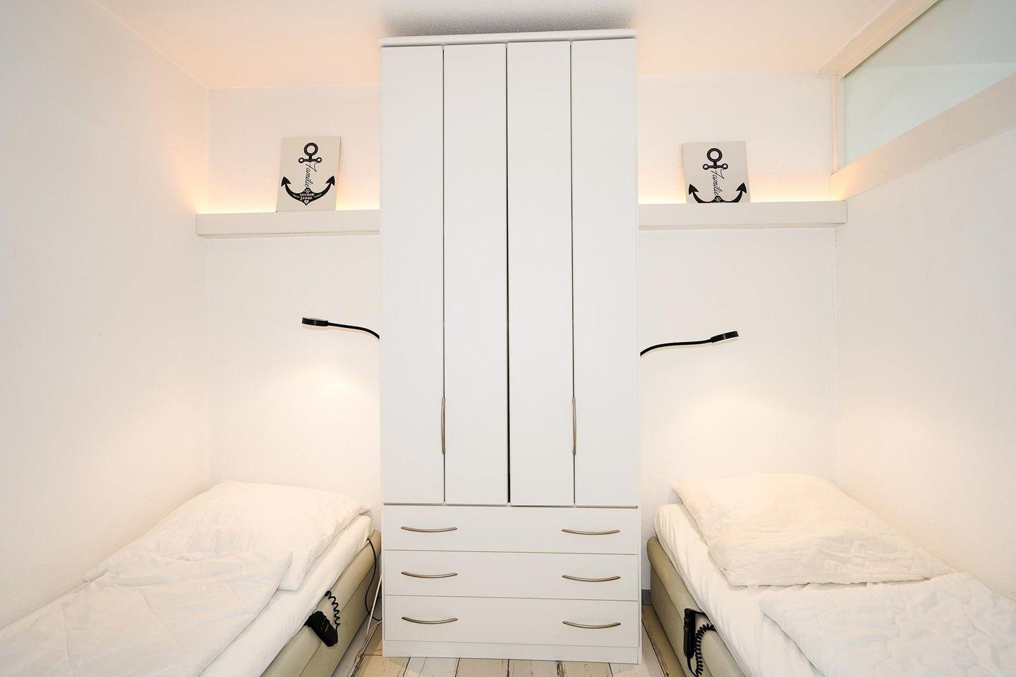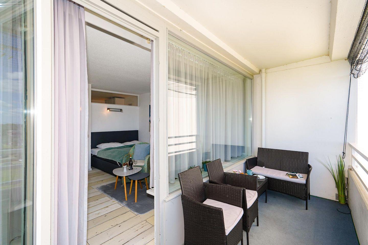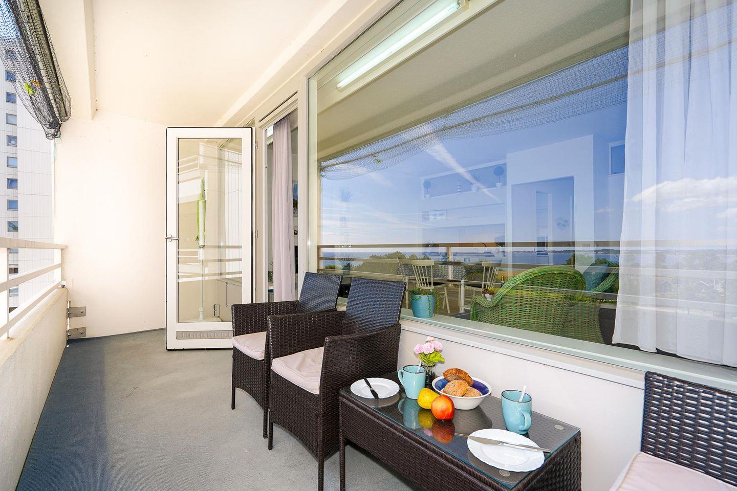 Über einen Fahrstuhl kann die in der 4. Etage gelegene Wohnung bequem erreicht werden. In dem hellen und gemütlich eingerichteten Wohnzimmer ist eine moderne Küche integriert. Diese enthält neben allen Kochutensilien auch eine komfortable Spülmaschine. Eine Essecke, eine bequeme Schlafcouch sowie ein großer Flachbildfernseher befinden sich ebenfalls im Wohnraum. Das Schlafzimmer ist mit zwei Einzelbetten eingerichtet. Das Badezimmer verfügt über eine Dusche. Von dem mit wetterfesten Möbeln ausgestatteten Balkon eröffnet sich eine Aussicht auf das Meer in Richtung der Ortschaft Pelzerhaken. Bis zum Ostseestrand sind es nur 3 Gehminuten.