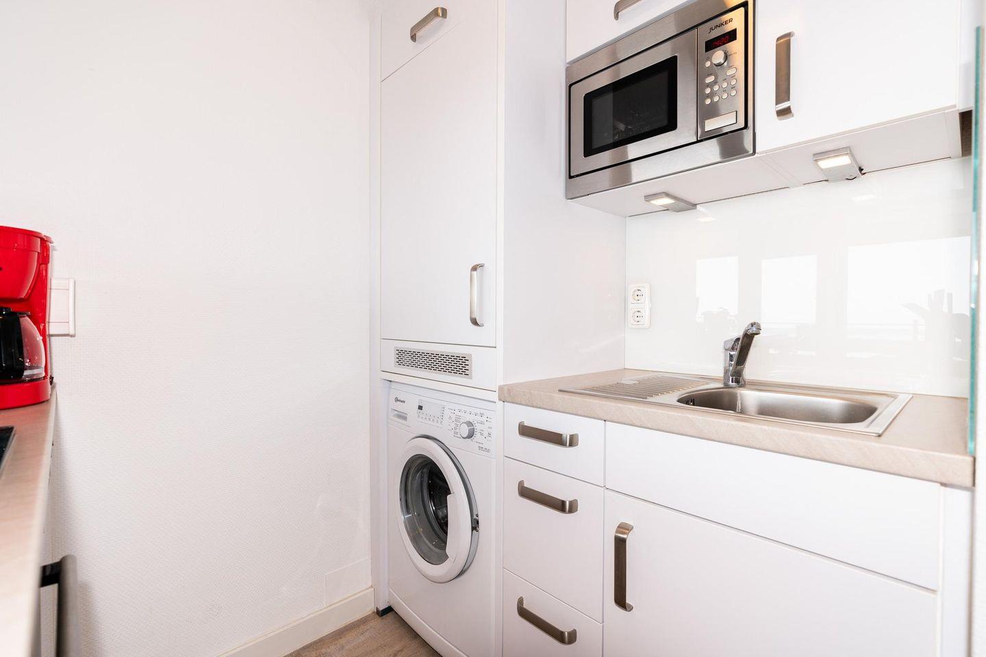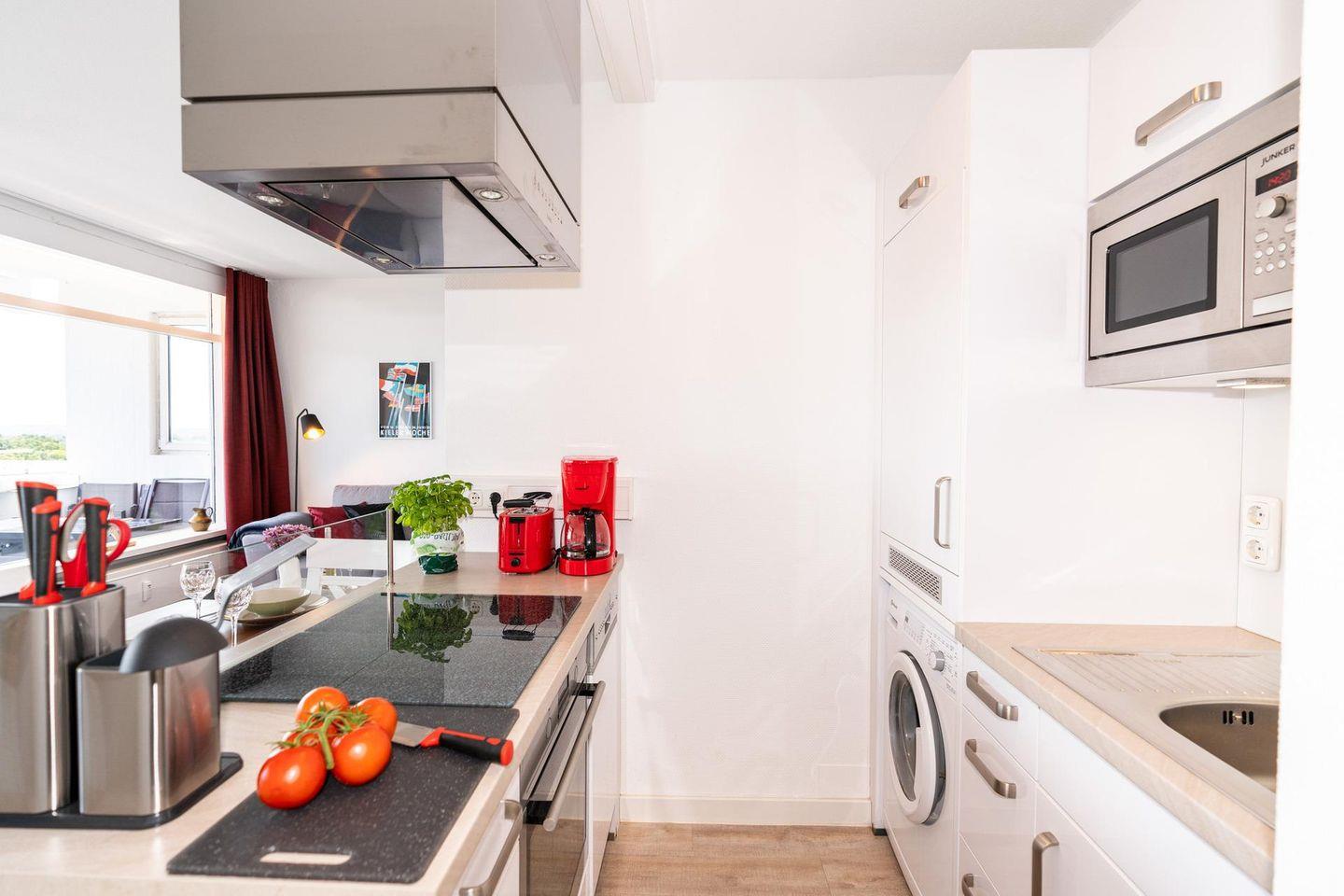 Die kleine und offene Küche ist mit Backofen, Herd, Spülmaschine, Mikrowelle, Wasserkocher, Kaffeemaschine und Toaster ausgestattet - ideal, um auch im Urlaub entspannt zu kochen.