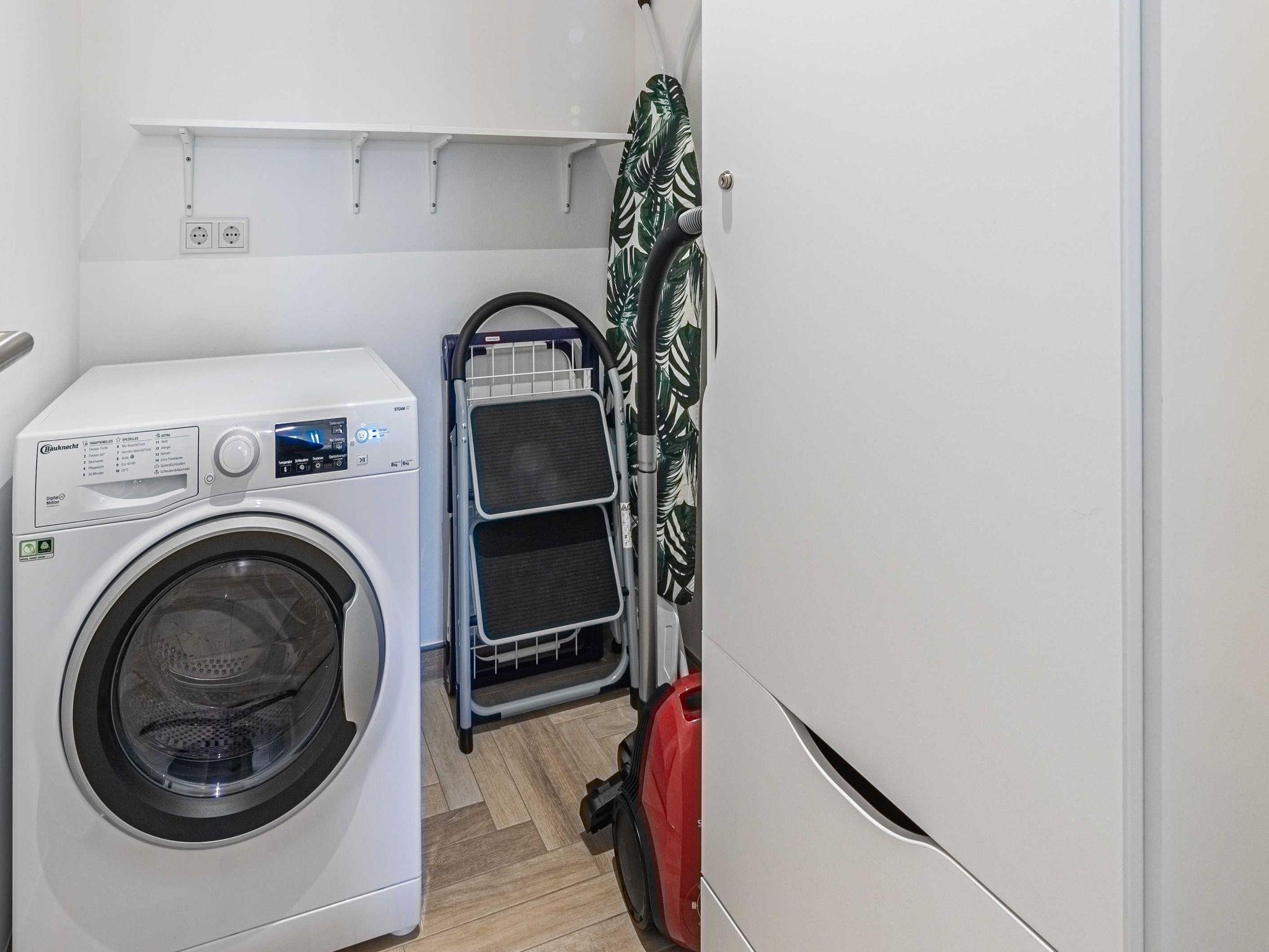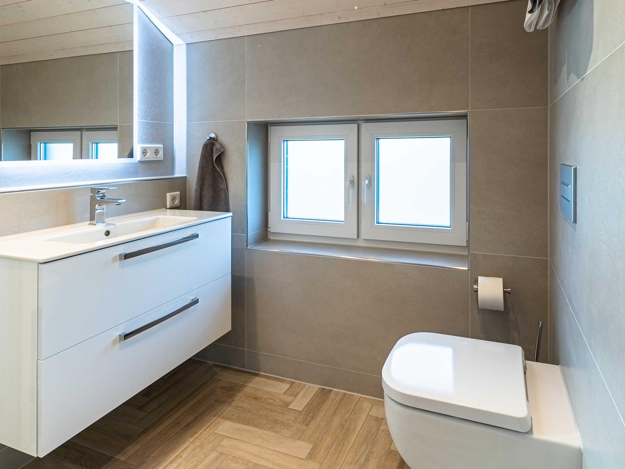Die Böden der Ferienwohnungen sind mit hochwertigem Feinsteinzeug (Fliesen) im Fischgrät-Design belegt und eine Fußbodenheizung (pro Raum steuerbar) sorgt für behagliche Wärme. Im separaten Abstellraum steht Ihnen zur kostenfreien Nutzung eine Waschmaschinen-Trockner-Kombi (Waschmittel bitte mitbringen), nebst Bügeleisen und Bügelbrett zur Verfügung. Ein Insektenschutz ist ebenfalls vorhanden wie auch ein kostenfreier WLAN-Zugang. Die bodentiefen Fenster und Terrassentüren und das Fenster in der Sauna sorgen für lichtdurchflutete Räumlichkeiten, die über teilweise auch elektrisch betriebene Schiebeläden für Privatsphäre oder Sonnenschutz sorgen. Das Dach ist mit einem zusätzlichen Hitzeschutz ausgestattet, die auch an heißen Tagen zusammen mit den geschlossenen Schiebeläden eine angenehme Temperatur in den Räumen für einen erholsamen Schlaf sorgen.