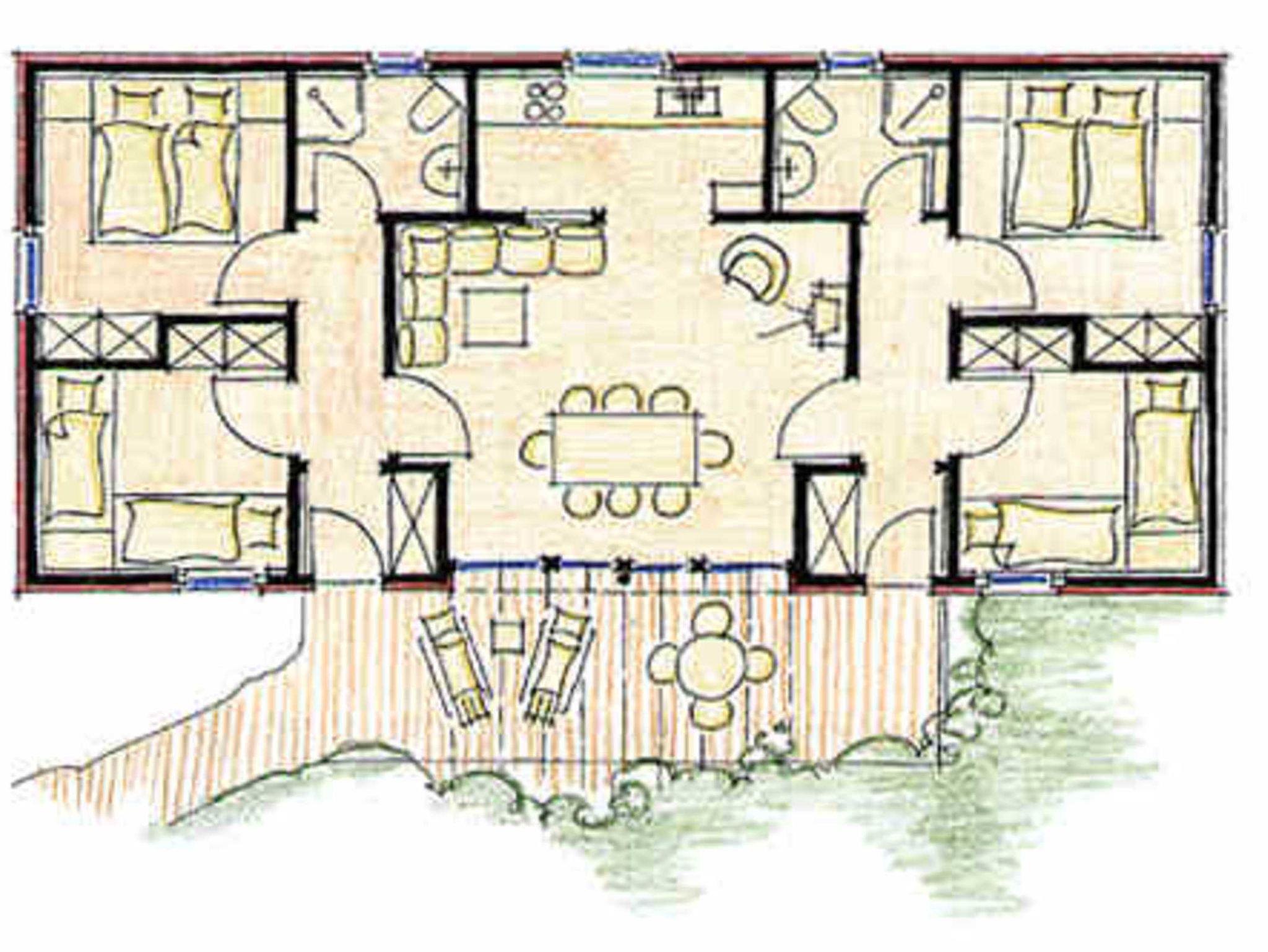Das ca. 88 m² große Ferienhaus bietet Platz bis zu 8 Personen. Die Küche ist zum Wohnraum offen und mit allen notwendigen Küchenuntensilien ausgestattet. Am großen Esstisch können Sie Ihre Mahlzeiten einnehmen. Die zwei Bäder sind mit Dusche/WC und Waschtisch ausgestattet. Eine Terrasse befindet sich direkt vor der Unterkunft und lädt zum Verweilen ein. Die Waschmaschine und der Trockner befinden sich im Wirtschaftshaus und werden für alle Gäste der Anlage gegen Gebühr bereitgestellt. Das Mitbringen von Haustieren ist unbedingt vorab mit dem Vermieter abzustimmen und es fallen Gebühren an. Bei den ausgewiesenen Bildern handelt es sich um Wohnbeispiele.