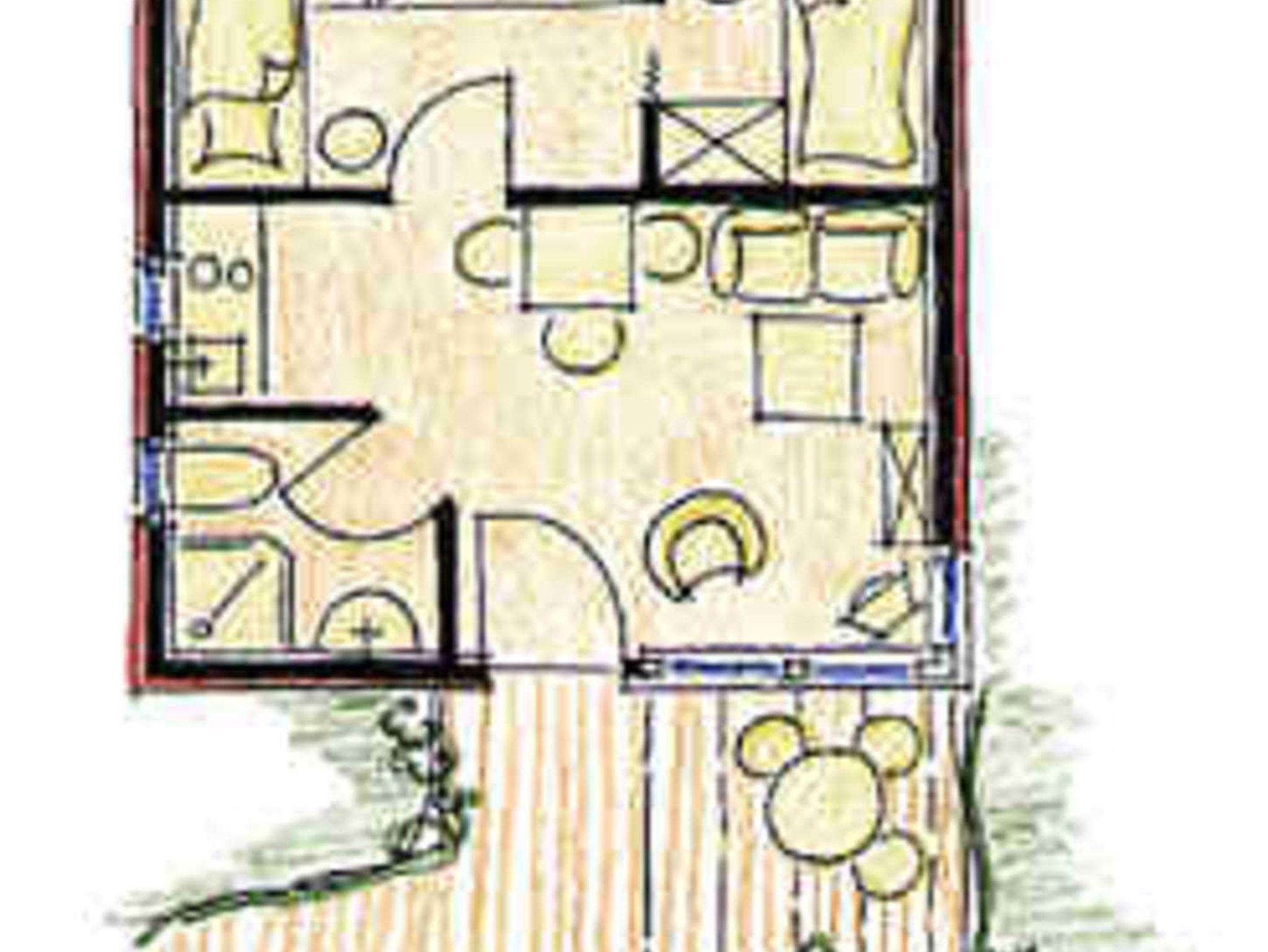 Der Bungalow ist ca. 32 m² groß und ist für bis zu 3 Personen ausgestattet. Im Wohnraum befindet sich eine Sofaecke mit TV und Schrankteil. Die Küchenzeile ist offen zum Wohnraum. Das Schlafzimmer ist ausgestattet mit drei Einzelbetten (ein Bett in einer Schlafnische, abgetrennt durch eine Tür). Im Bad finden Sie ein WC, einen Waschtisch und eine Dusche. Eine kleine Terrasse lädt zum Verweilen ein. Die Waschmaschine und der Trockner befinden sich im Wirtschaftshaus und werden für alle Gäste der Anlage gegen Gebühr bereitgestellt. Das Mitbringen von Haustieren ist unbedingt vorab mit dem Vermieter abzustimmen und es fallen Gebühren an. Bei den ausgewiesenen Bildern handelt es sich um Wohnbeispiele.