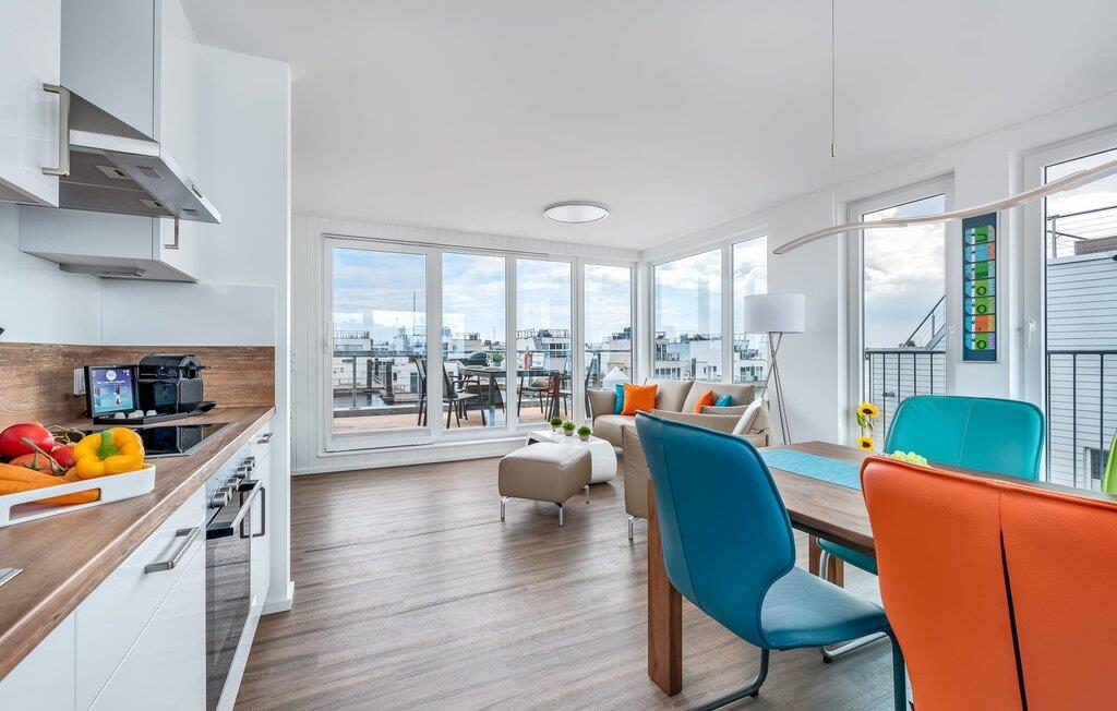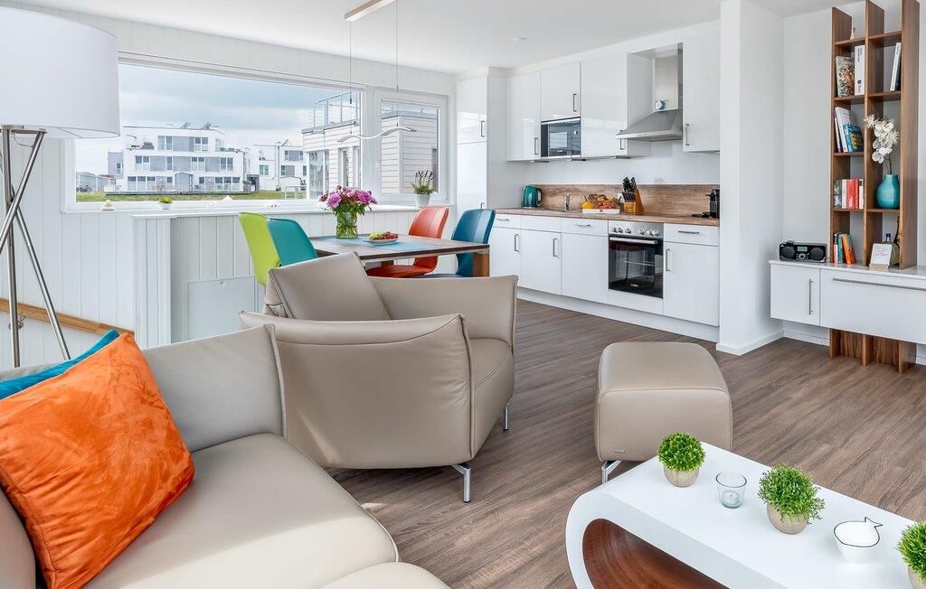 Når I hører husnavnet Sommer72, begynder det straks at virke i jeres hoved. Hvad var der? Hvor gammel var jeg og hvor var jeg? Hvad oplevede jeg i sommeren '72? Men det forklarer ikke navnet... Det flydende hus er et temahus, der er inspireret af de olympiske lege i 1972 i München og Kiel. Med udgangspunkt i tidens farvekoncept spiller den moderne og hyggelige indretning sammen med farverne orange, grøn og turkis. Originale plakater af forskellige vandsportsgrene dekorerer væggene. Føler I jer tiltalt? Så kan jeres rejse til dette særlige feriehus også starte på en sporty måde: Udover en parkeringsplads er der en bådplads lige ved siden af huset. Hvor sporty det end lyder, behøver I ikke at være sportsentusiast for at føle jer godt tilpas i denne eksklusive ferielejlighed. Dette sikres blandt andet af sauna med udsigt til vandet og bruser i gulvniveau i det rummelige badeværelse med hånd- og hovedbruser samt Kneipp-slange.
