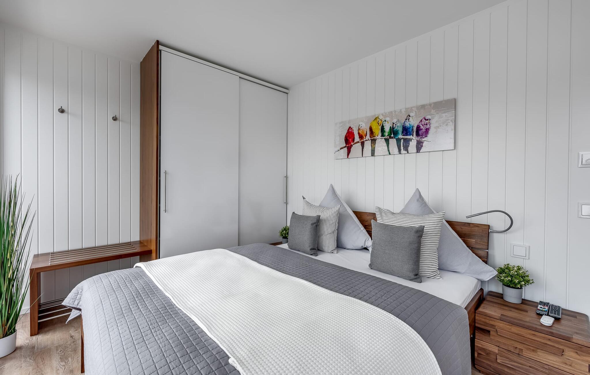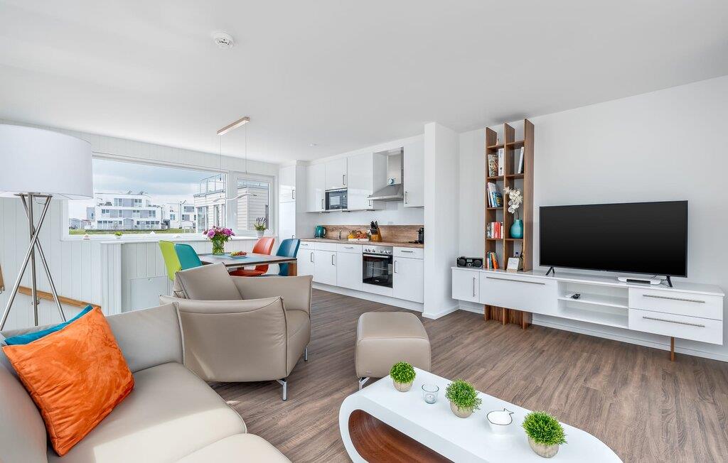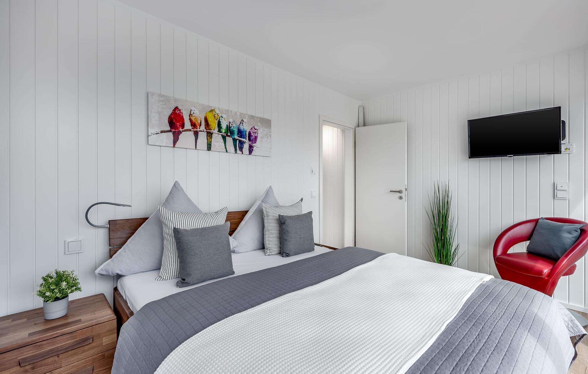I det første soveværelse finder I en komfortabel dobbeltseng med et liggeareal på 1,60 x 2,00 m, hvorfra I kan se på vandet og himlen i fuldstændig afslapning takket være gulv-til-loft vinduerne. I det andet soveværelse finder I to enkeltsenge. Der er et fjernsyn i begge soveværelser. Indbyggede skabe med bagagehylder og tilstrækkelige kroge giver masser af opbevaringsplads. Følg lysbølgerne på den all-round terrasse direkte fra jeres liggestol. I kan ikke komme tættere på Østersøen!