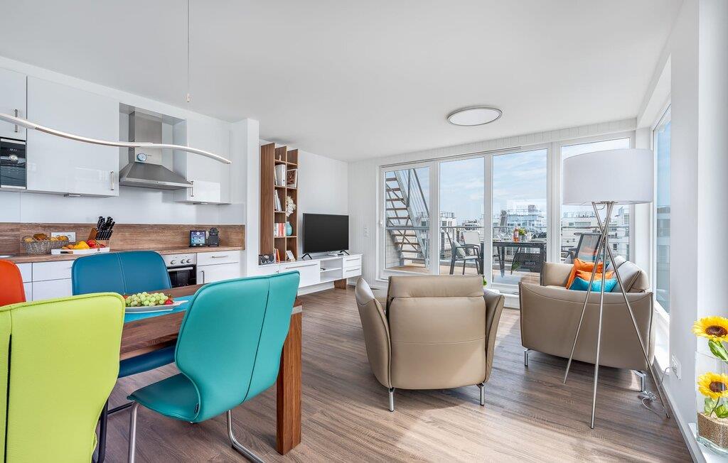 Første sal byder gæster velkommen med forhøjet udsigt over vandet! Det veludstyrede køkken med spiseplads til 4 personer flyder problemfrit ind i opholdsrummet. Den luftige atmosfære understøttes af stilfulde og meget komfortable møbler. Sofa og lænestole lægger op til at blive hængende. Og hvis havnebiografen ikke er nok, er der også et fjernsyn med magenta-tv og en internetradio tilgængelig her. Terrassen, der støder op til opholdsområdet, er veludstyret med et stort havebord og fire komfortable stole til en solid morgenmad i morgensolen eller en dejlig grillaften. Herfra fører en smal udvendig trappe til højdepunktet i Sommer72: den store tagterrasse! Beskyttet mod vinden i en strandstol eller slapper af på liggestolen, kan I nyde og se sejlerne på Slien og travlheden i havnen eller bare slappe af og slappe af. Denne unikke panoramaudsigt er fænomenal og inspirerende. Ingen steder kan I se spillet af elementerne vind og bølger, sol og strand mere afslappet. Vores favoritsted: Der er flere: den røde stol i stueetagen, lænestolen på første sal og strandstolen på tagterrassen. Hvad bliver dit? Bemærk venligst, at OstseeResort Olpenitz stadig er under opbygning. På grund af husene under opførelse kan udearealet og bygningstætheden konstant ændre sig og afvige fra de viste billeder. Lejeprisen er allerede beregnet ud fra denne byggesituation. Yderligere rabatter er udelukket.