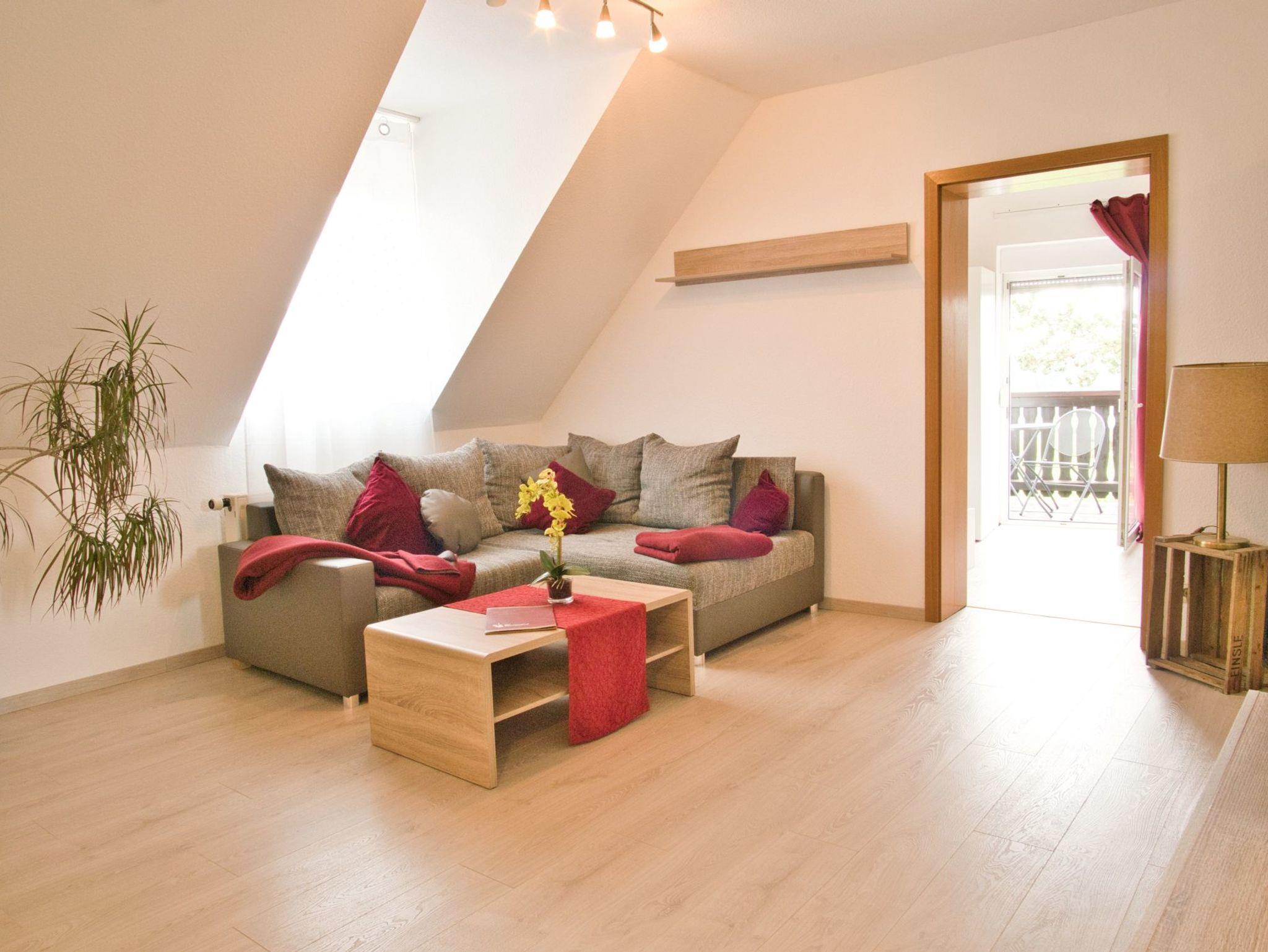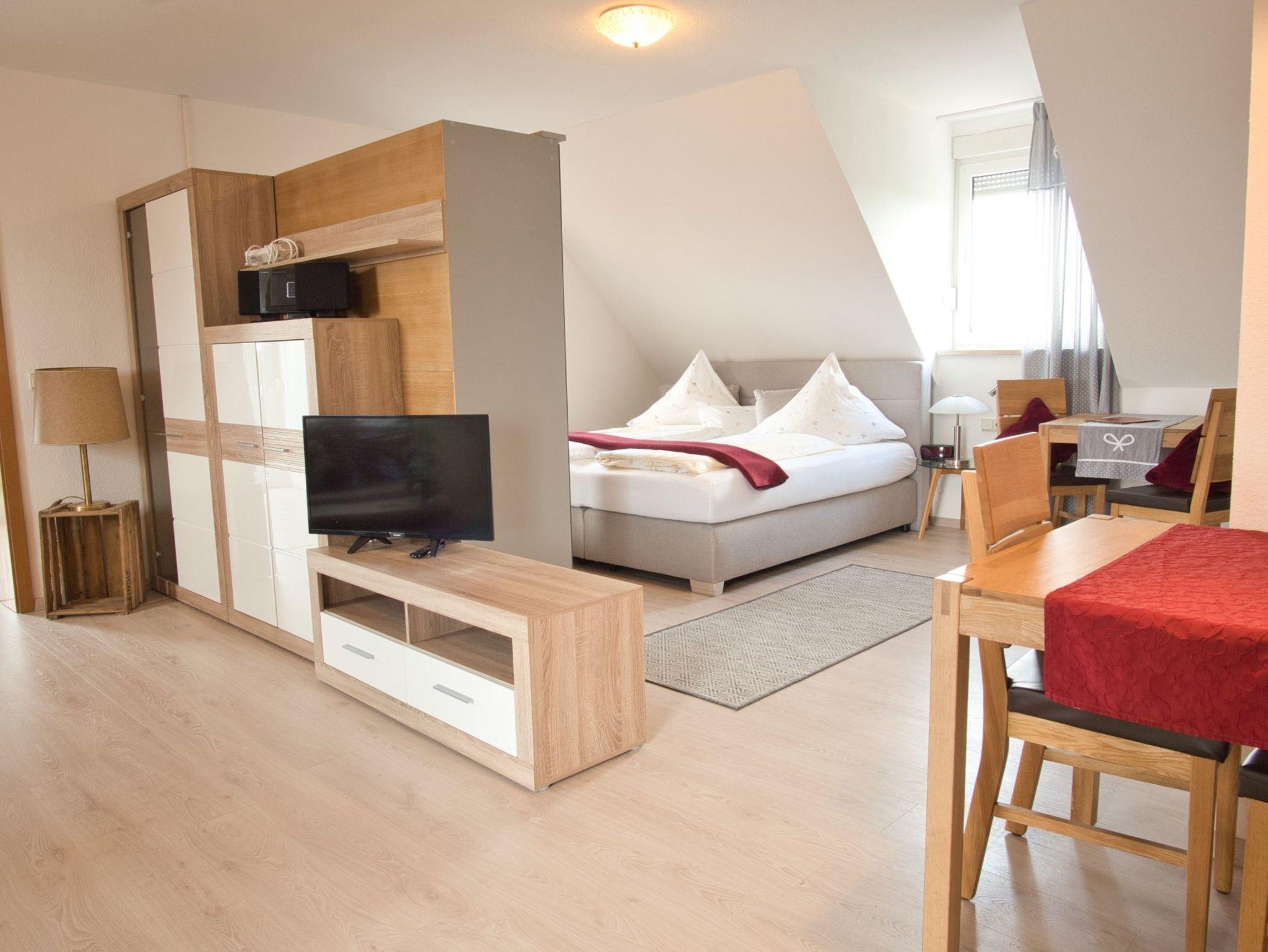 Flachbild-TV, Föhn ,Bad mit ebenerdiger Dusche,Bettwäsche, Handtücher, Balkon mit Morgensonne und Blick in die Weinberge.