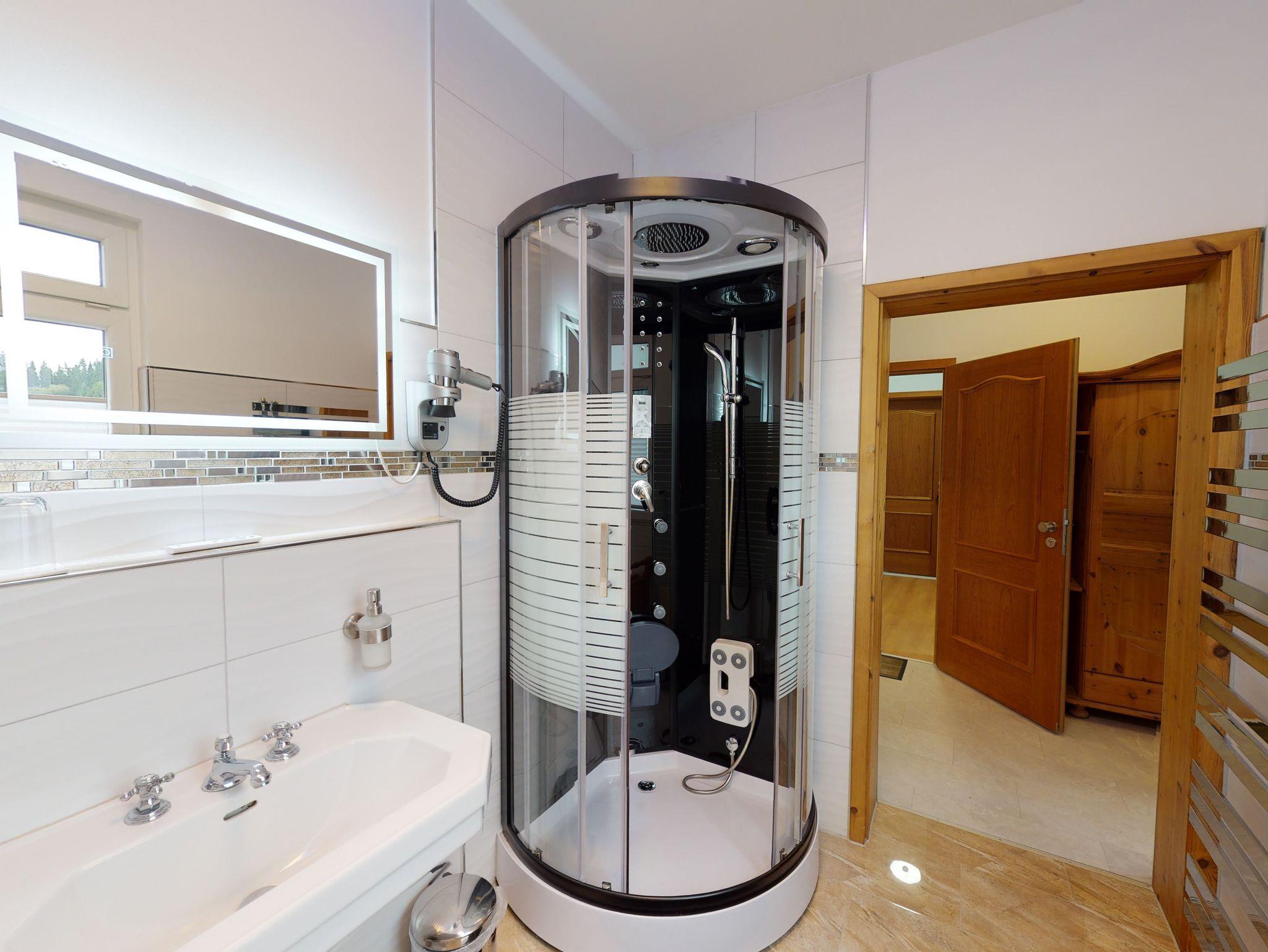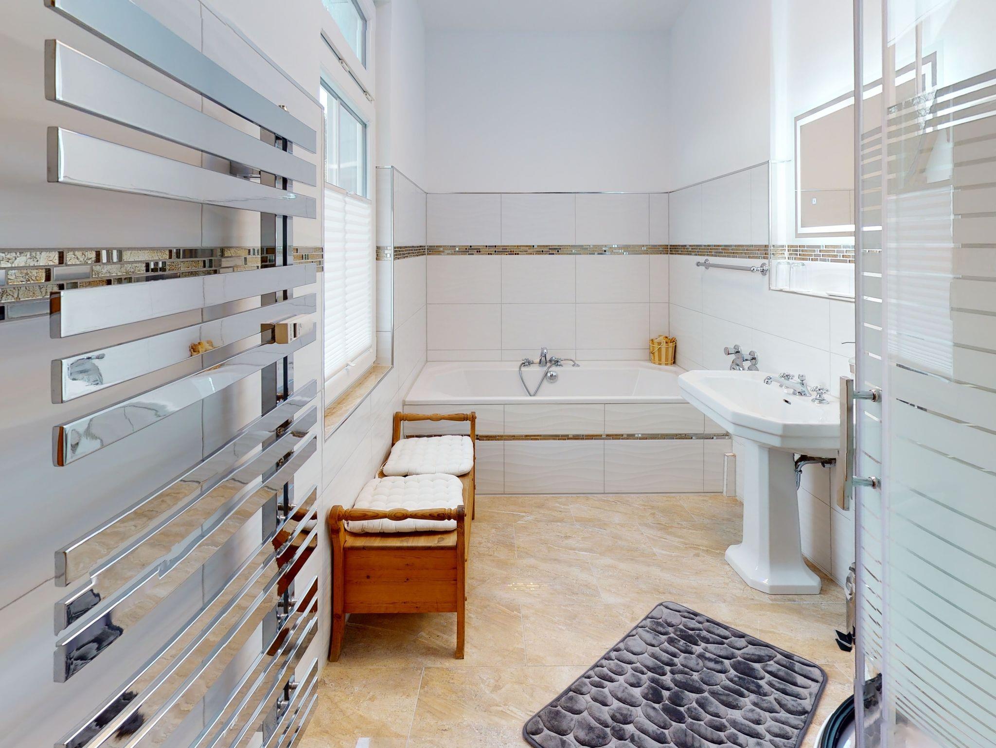 Das helle Tageslicht Badezimmer mit Badewanne und Wellness-Dusche sowie einem Handtuchwärmer lädt zum relaxen ein.