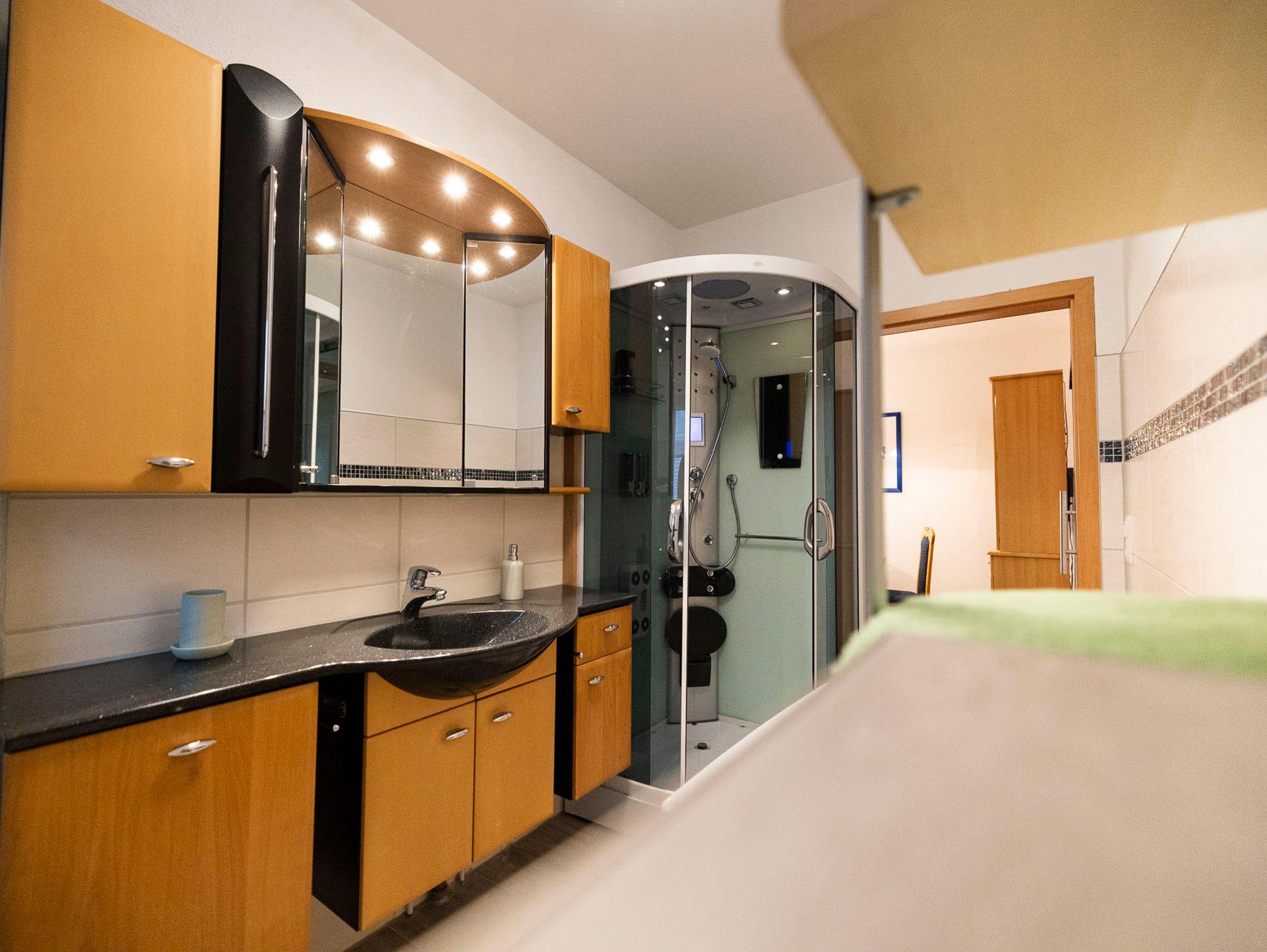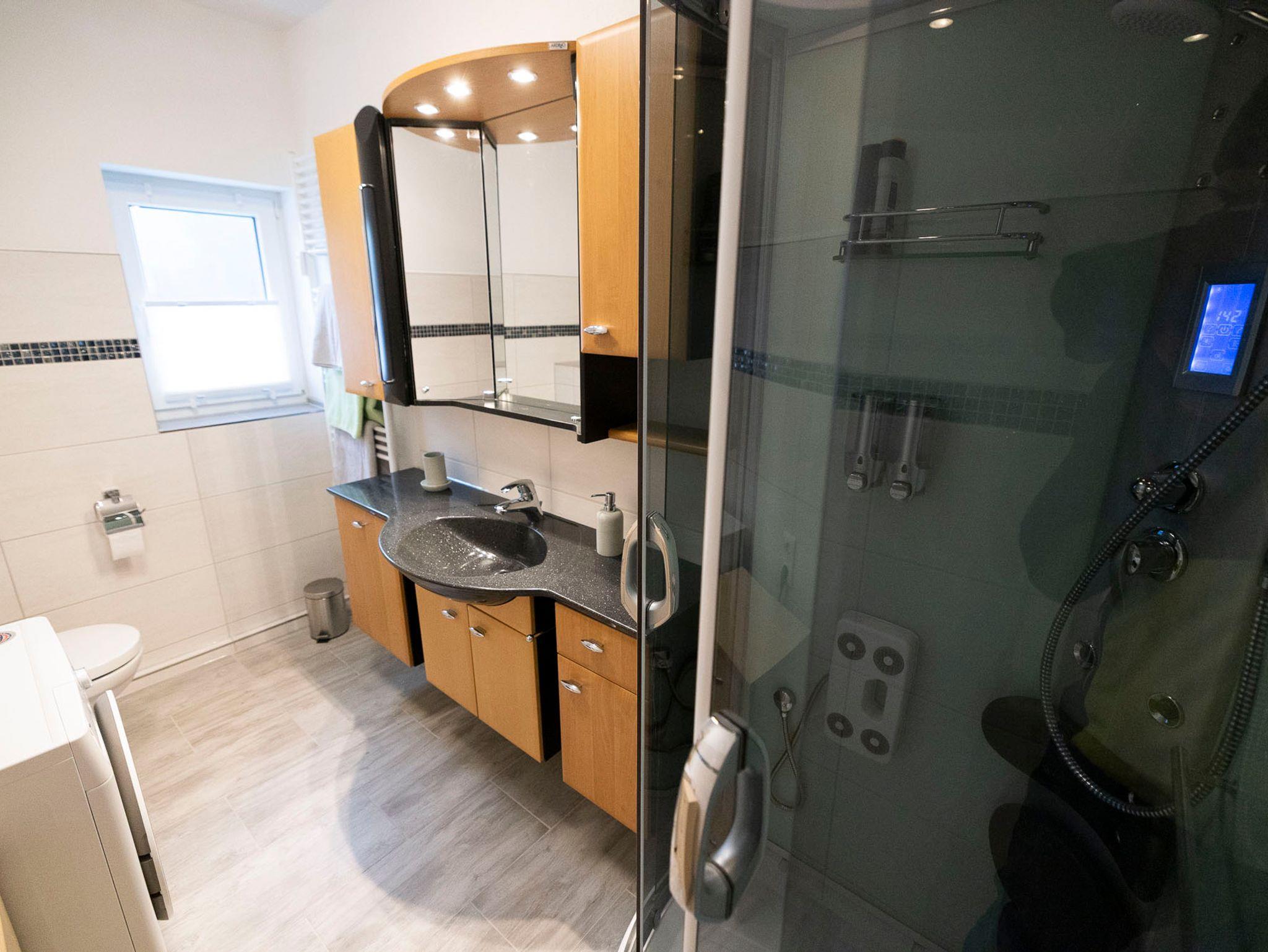 Das helle Tageslicht Badezimmer mit WC, Wellness-Dusche Waschtisch in Bad Möbel eingebaut sowie einem Handtuchwärmer lädt zum relaxen ein.