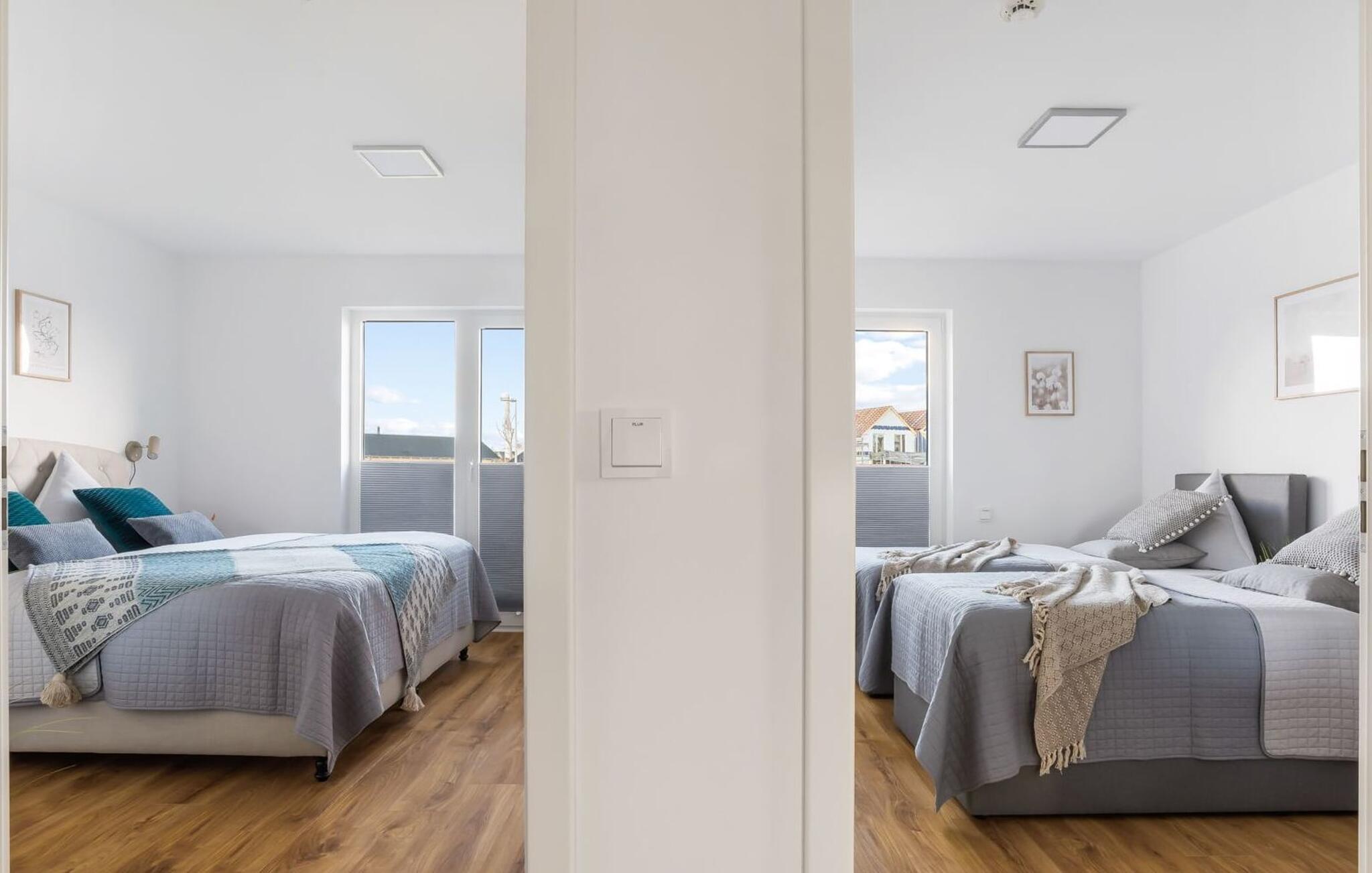 Mens det første soveværelse forkæler jer med en luksuriøs 1,80 m bred kingsize-seng, tilbyder det andet soveværelse to komfortable 90 cm brede enkeltsenge, som kan skubbes sammen om nødvendigt. Begge soveværelser har et klædeskab og et ekstra tv. Til de yngste gæster på solsiden er der en rejseseng og en højstol til rådighed.
