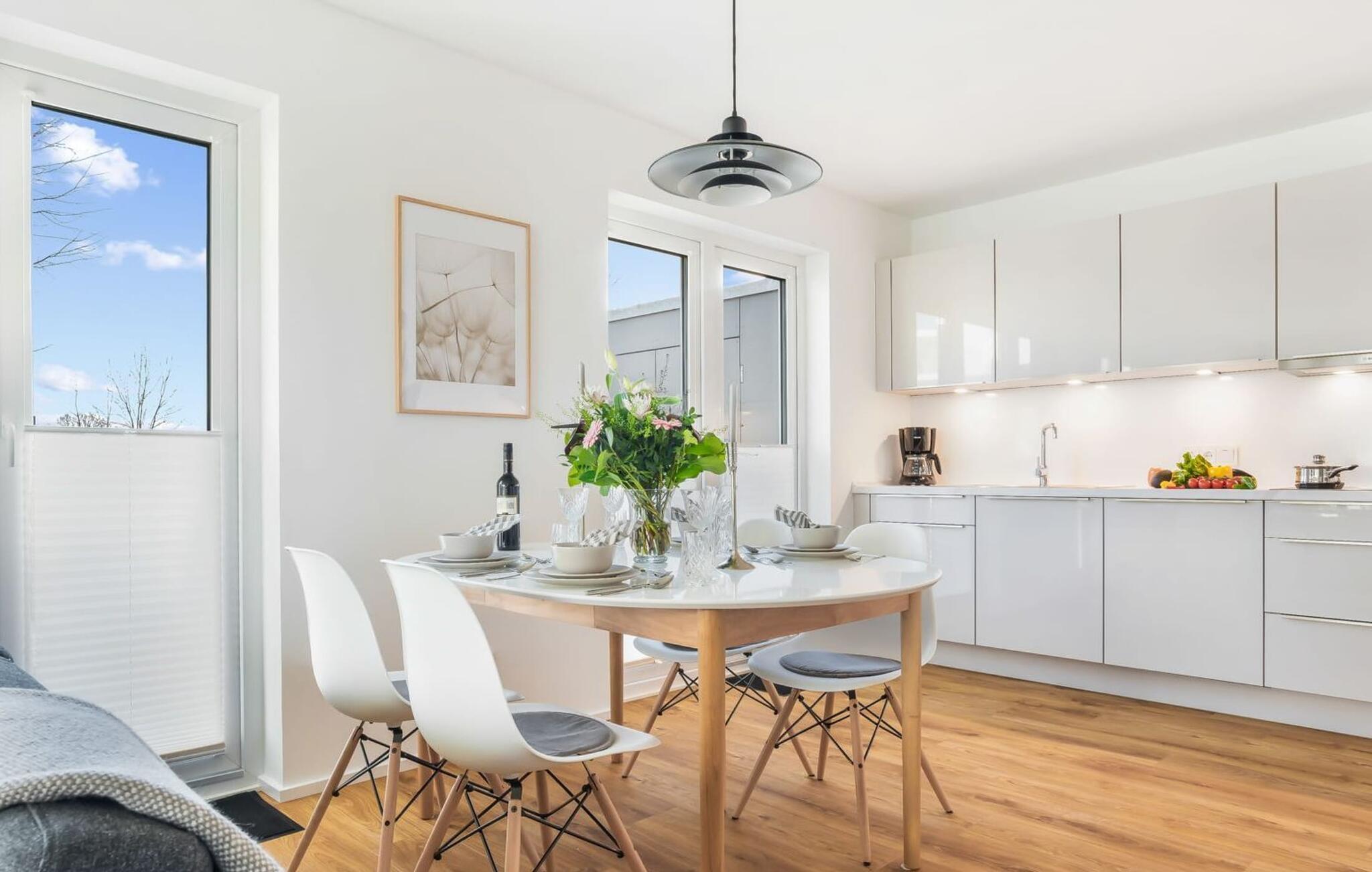 Med sine gulv-til-loft-vinduer og den tilstødende store terrasse er den åbne stue/spisestue lejlighedens hjerte. Kom ind, sæt hverdagen på pause og føl jer hjemme med det samme. Slap af i den komfortable opholdsstue og nyd udsigten over naturen fra vinduet. Dette er ren afslapning.
