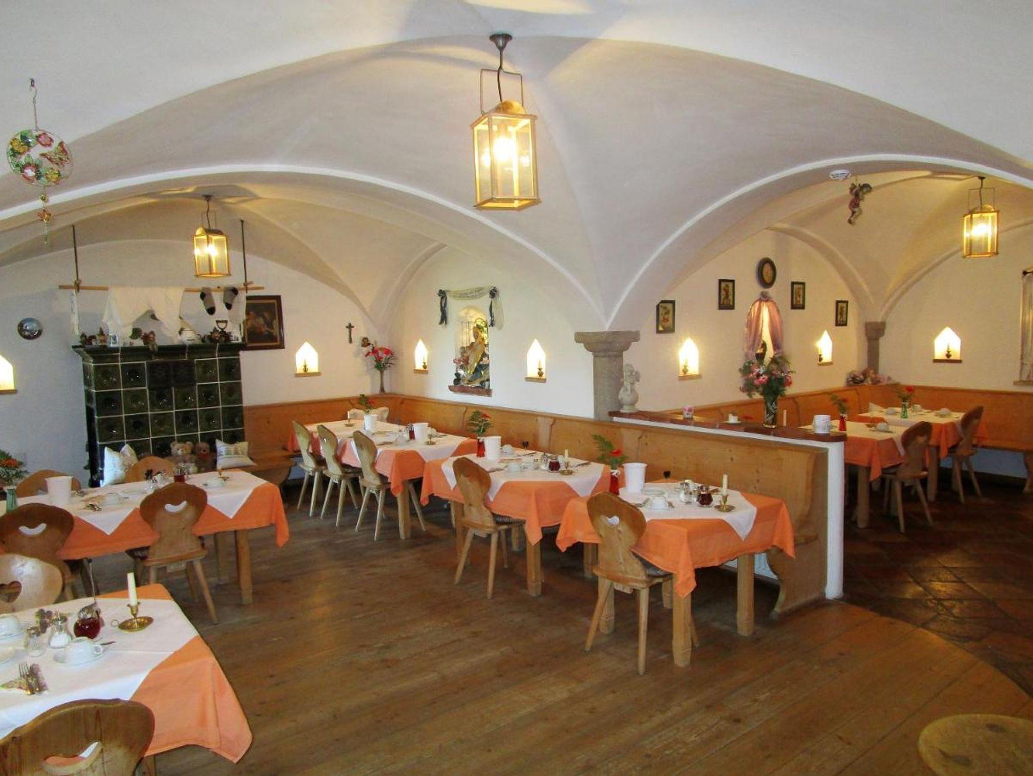 Die Parkplätze sind direkt am Haus. Das reichhaltige Frühstücksbuffet im rustikelen Frühstücksraum mit Kreuzgewölbe kann optional dazugebucht werden.
