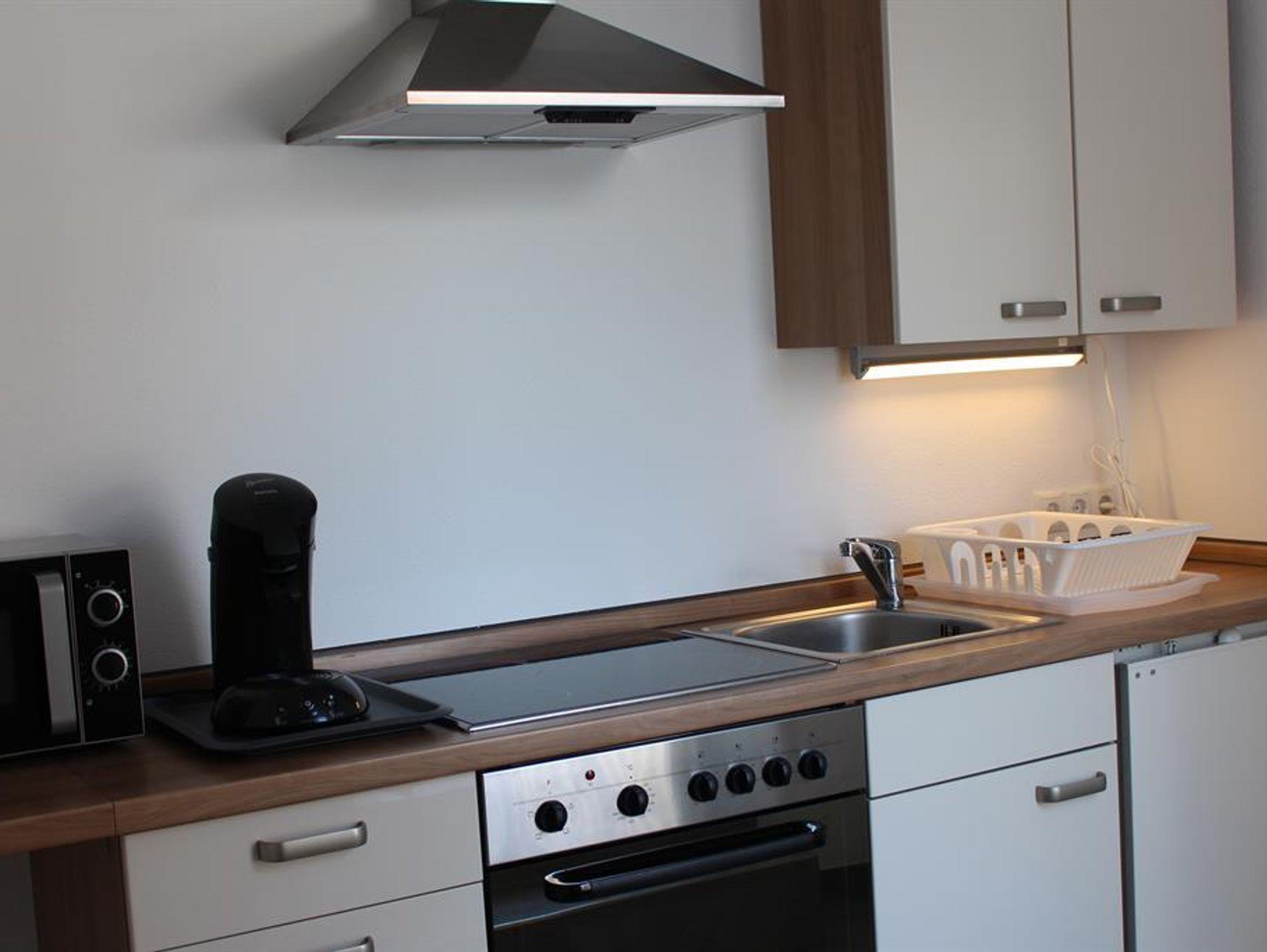 gut ausgestattete Küche mit Cerankochfeld, Backofen, Mikrowelle, Kaffeepadmaschine und Wasserkocher