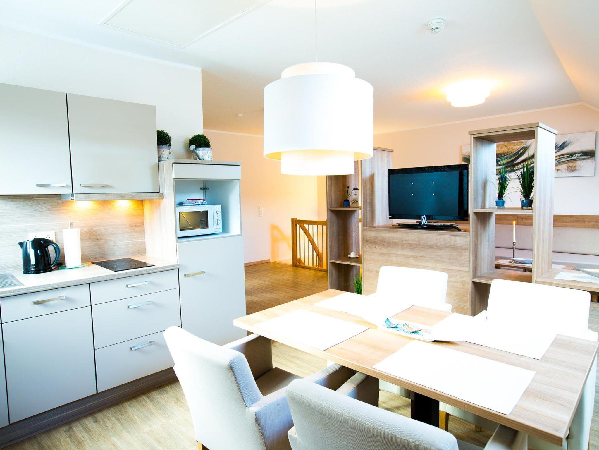• Essbereich und Kitchenette mit 2er Cerankochfeld, Mikrowelle, Geschirrspülmaschine, Spüle, Kühlschrank, Filter- und Nespresso-Kaffeemaschine, Wasserkocher, Toaster, Geschirrset/Besteck, separater Esstisch für bis zu 4 Personen