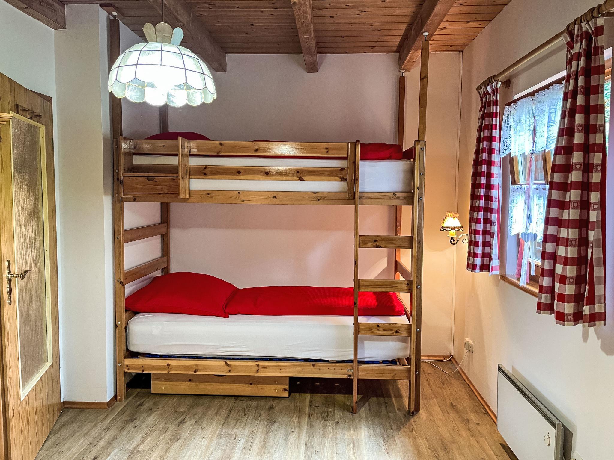 3-room semi-detached house 100 m2 on 2 levels. Cosy and wooden furniture furnishings: living/dining room with Scandinavian wood stove, dining table, satellite TV, radio and hi-fi system. Exit to the terrace. Open kitchen (oven, dishwasher, 4 ceramic glass hob hotplates, electric coffee machine, raclette grill, fondue Set (cheese)). Sep. WC. Top floor: 1 double bedroom with sloping ceilings with satellite TV. Exit to the balcony. 1 room with sloping ceilings with 2 beds and 1 x 2 bunk beds, satellite TV. Bath/shower/WC. Electric heating. Balcony. Balcony furniture. Facilities: washing machine, children's high chair, baby cot. Internet (WiFi). Please note: non-smokers only.