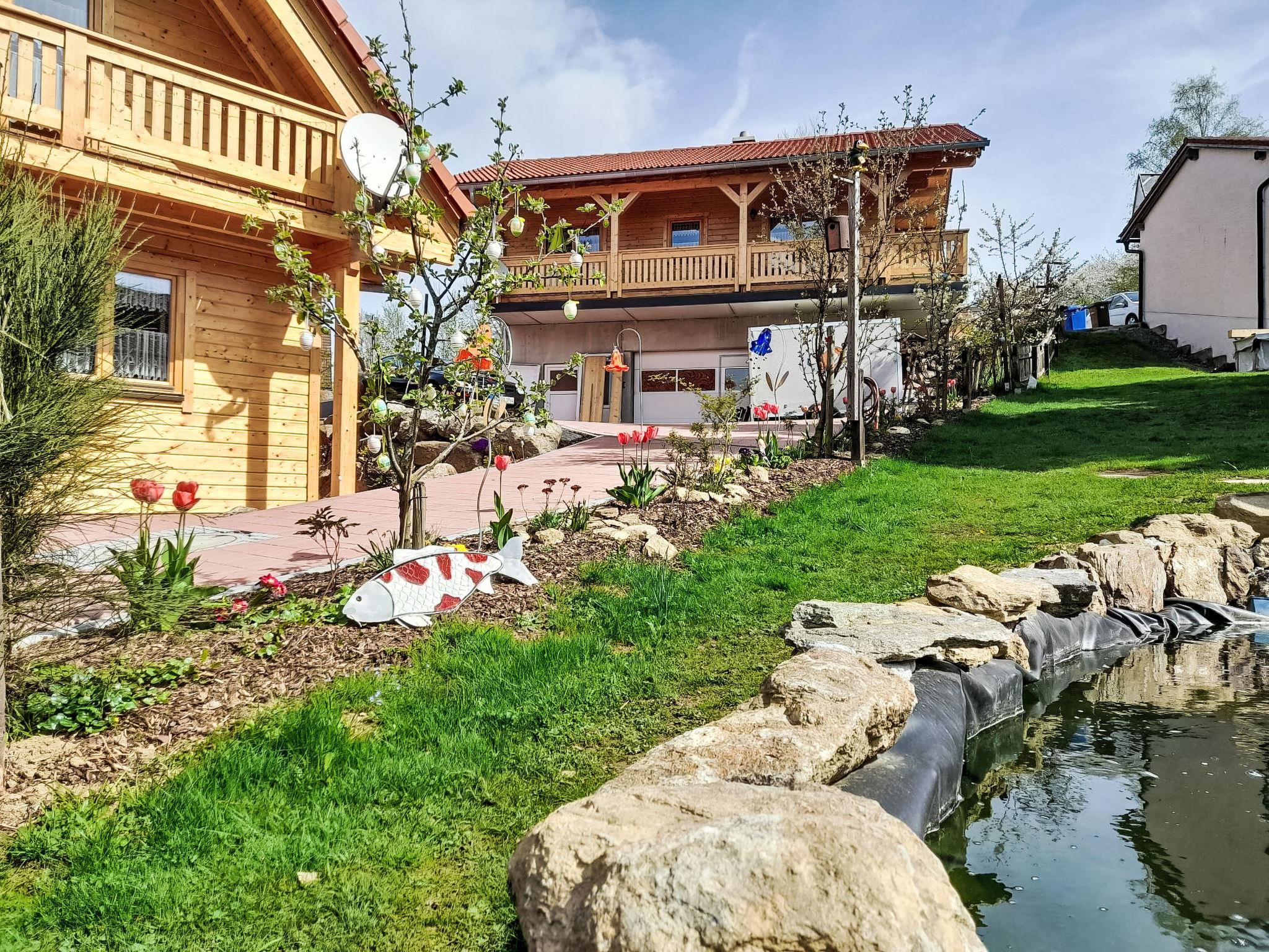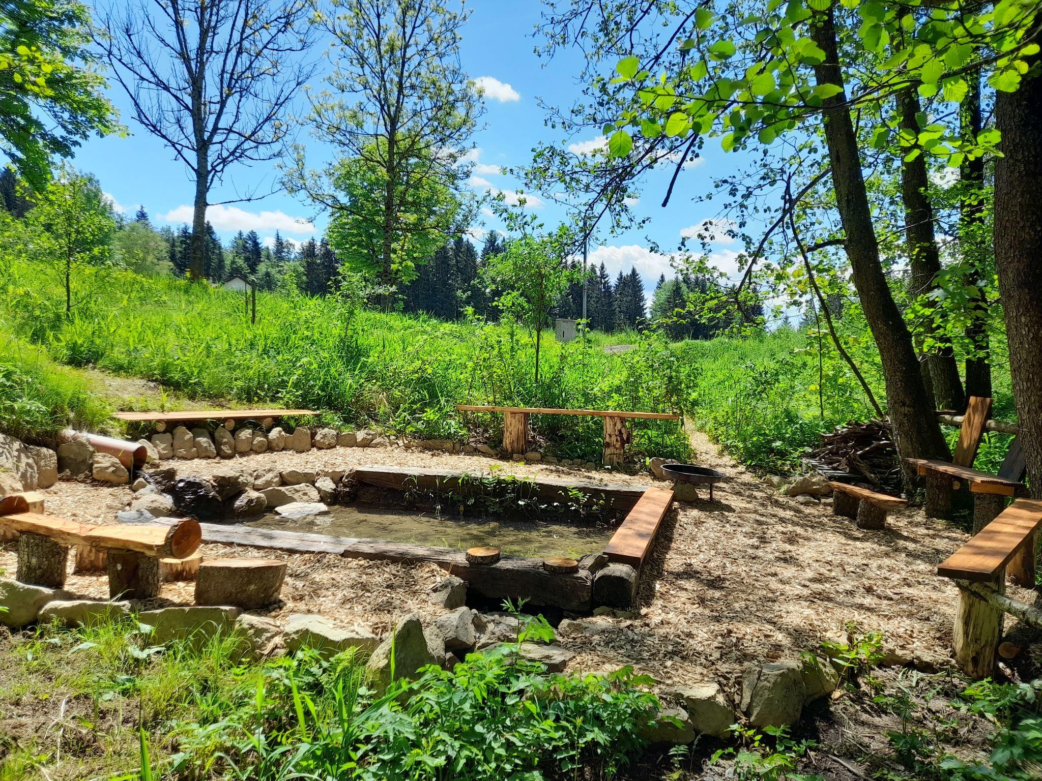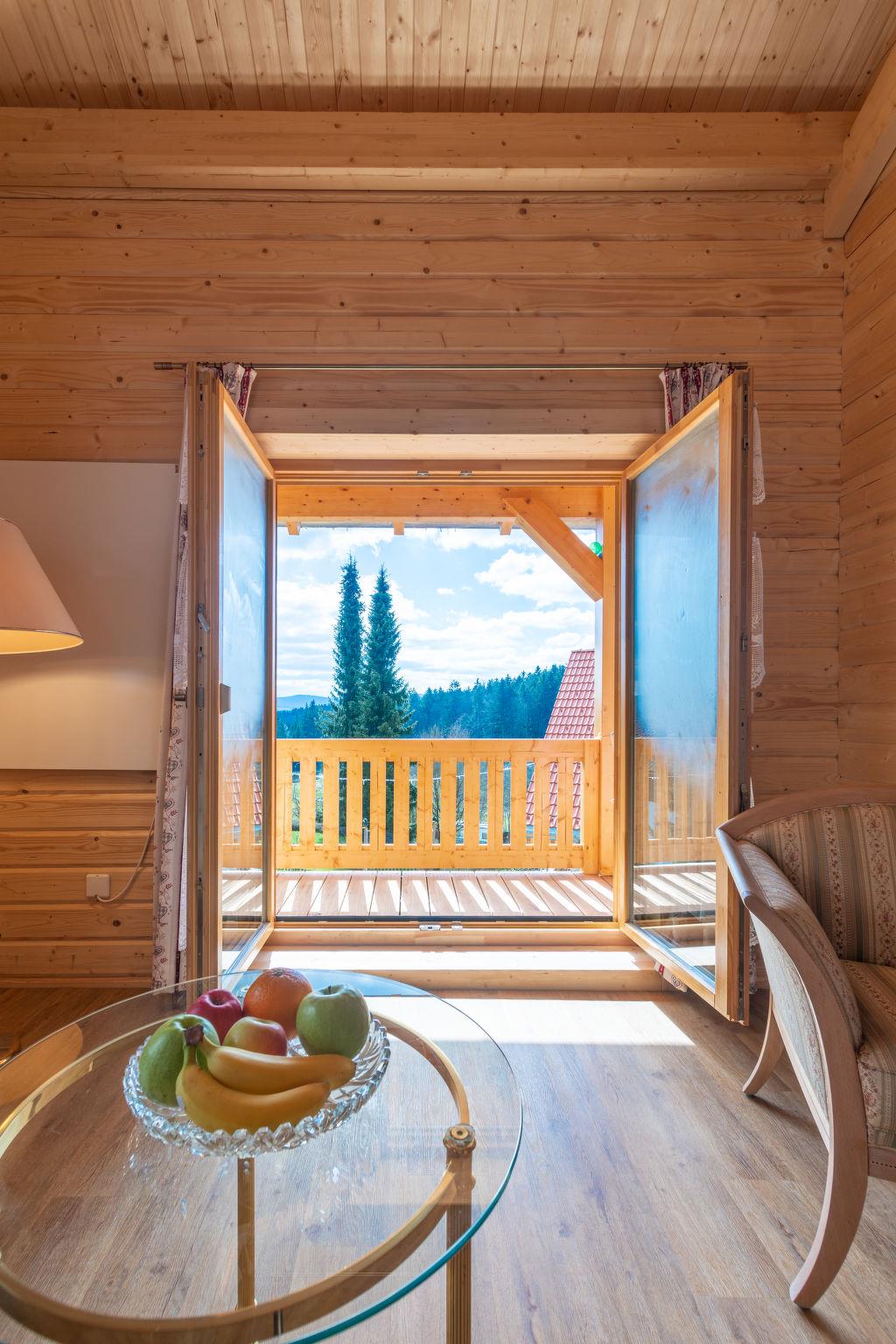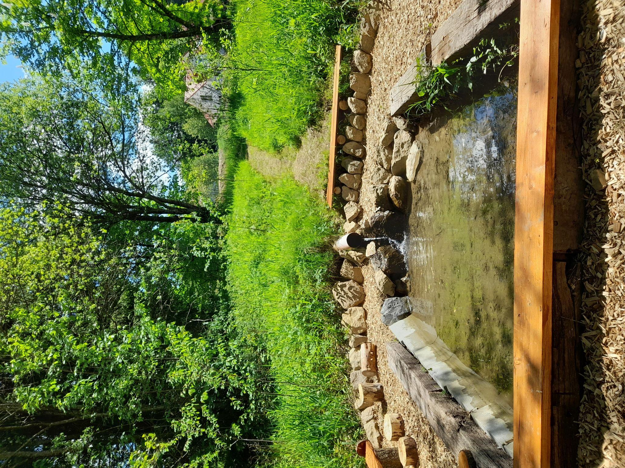 A family atmosphere in three comfortable log chalets. Largely self-sufficient energy supply with photovoltaic systems, infrared heating and Swedish stoves. Firewood comes from the property's small forest with a natural pond and stream. From approximately May 24, a chicken coop with outdoor enclosure will be available. Children can pet and feed the chickens and collect their own eggs. Small, child friendly resort, built in 2022. 3 houses in the residence. In the district of Mühlberg 2 km from the centre of Spiegelau, on a slope. For shared use: property 6'000 m2 with meadow, natural pond, swimming pool round (8 m diameter, seasonal availability: 15.May. - 30.Sep.). Patio. In the house: sauna, bicycle rental. Bread roll service. Shop 1 km, supermarket 2.5 km, bus stop "Palmberg" 1 km, railway station "Spiegelau" 3.5 km, outdoor swimming pool 2.5 km. Walking paths from the house 10 m, sled run 1 km. Nearby attractions: Nationalparkzentrum Neuschönau 17 km, Baumwipfelpfad 17 km, Passau 45 km. Well-known ski regions can easily be reached: Mitterfirmiansreut 31 km, Geißkopf 22 km, Großer Arber 37 km. Hiking paths: Nationalpark Bayerischer Wald 3 km. Please note: Loading and unloading of baggage is possible at the holiday house.