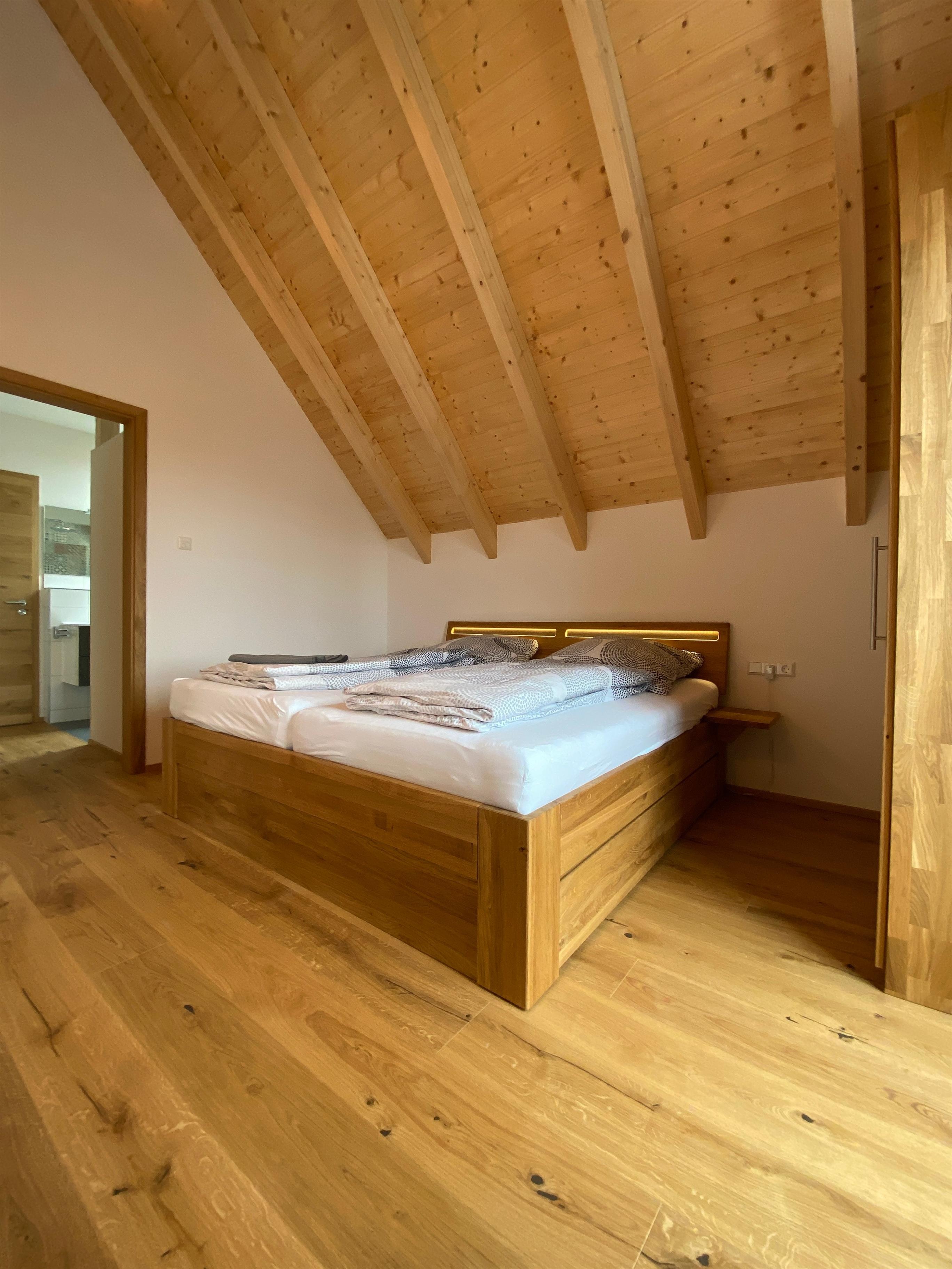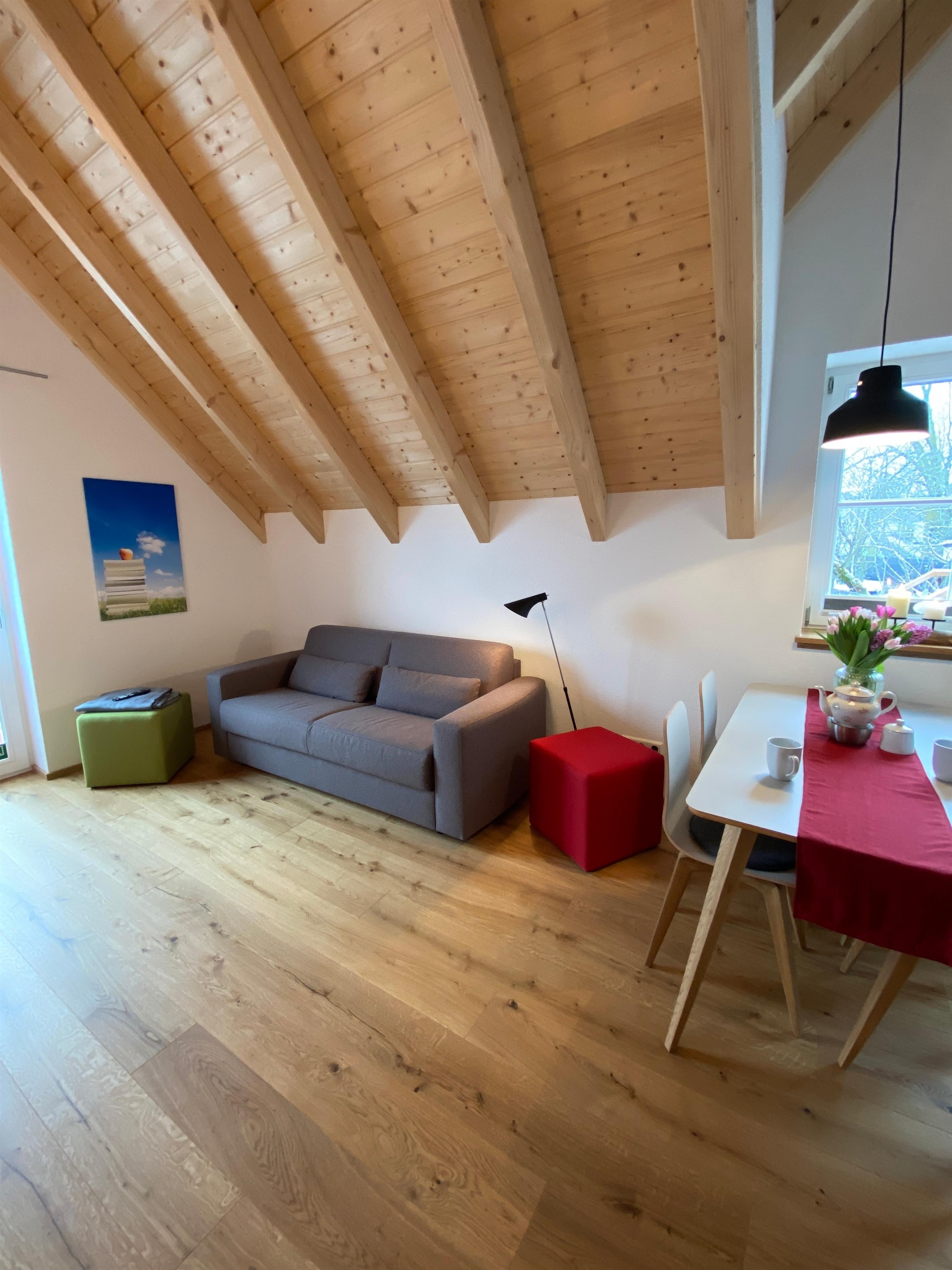 Die Ferienwohnung in unserem Neubau liegt in herrlicher Landschaft, hoch in den Kronen der Bäume unserer Apfelbaumwiese. Wir haben die Wohnung liebevoll ausgestattet, genauso wie wir es uns in einer Ferienwohnung auch wünschen. Die Raumhöhe, die Holzarchitektur und die Vollholzmöbel sind die besten Voraussetzungen für einen qualitätvollen Wohlfühlaufenthalt.