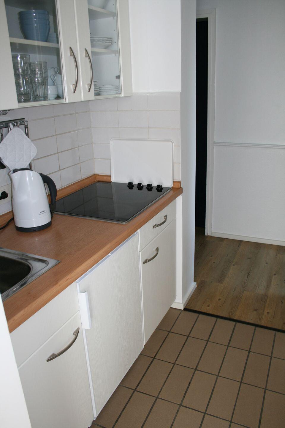 Einbauküche mit Toaster, Wasserkocher, Kaffeemaschine und Backofen; komplett saniertes Bad mit Dusche und WC, Fenster, Föhn und Kosmetikspiegel; Hochstuhl,