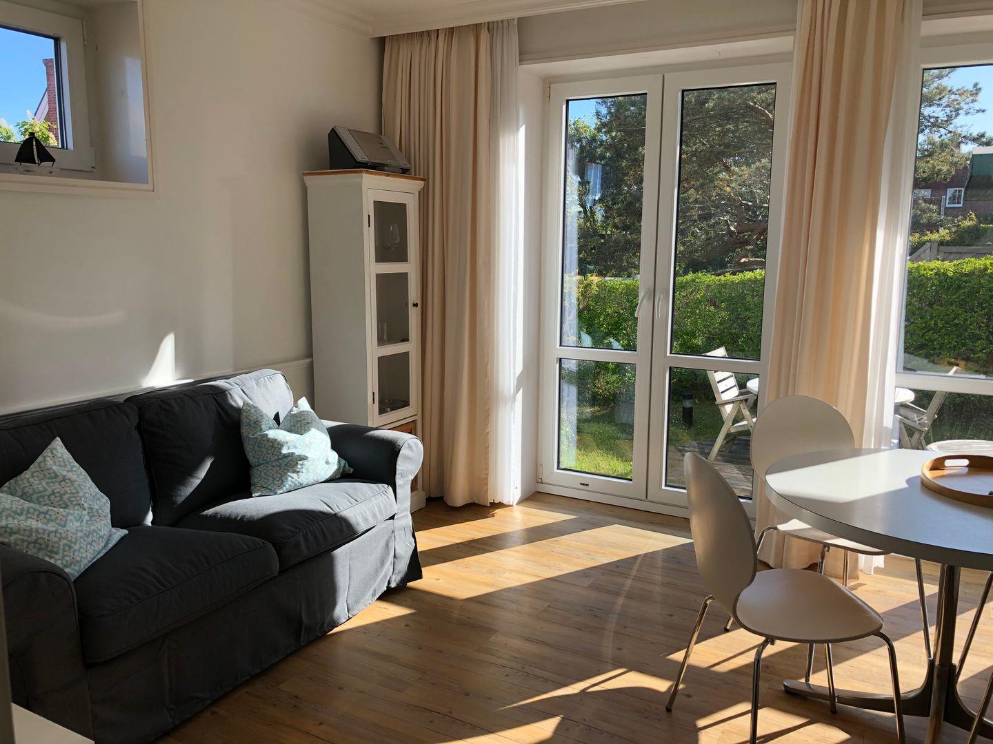 Lichtdurchflutete Ferienwohnung (ca. 40 m² im EG) mit Süd-/Westterrasse und Garten für bis zu 3 Personen; 1 Schlafzimmer mit Doppelbett, 1 separates Schlafzimmer mit einem Bett.