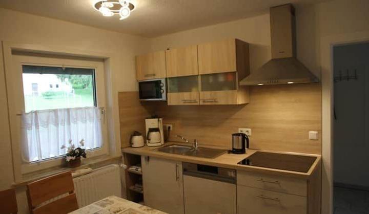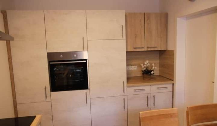 Es ist eine umfangreich ausgestattete Einbauküche vorhanden. Unter anderem gehören zum Inventar eine Spülmaschine, ein großer Kühlschrank mit Gefrierfach, ein Backofen, eine Mikrowelle, eine Kaffeemaschine (wahlweise für Senseo-Pads oder Filtertüten), ein Wasserkocher, ein Eierkocher, ein Toaster, eine Kaffeeisolierkanne u.a.