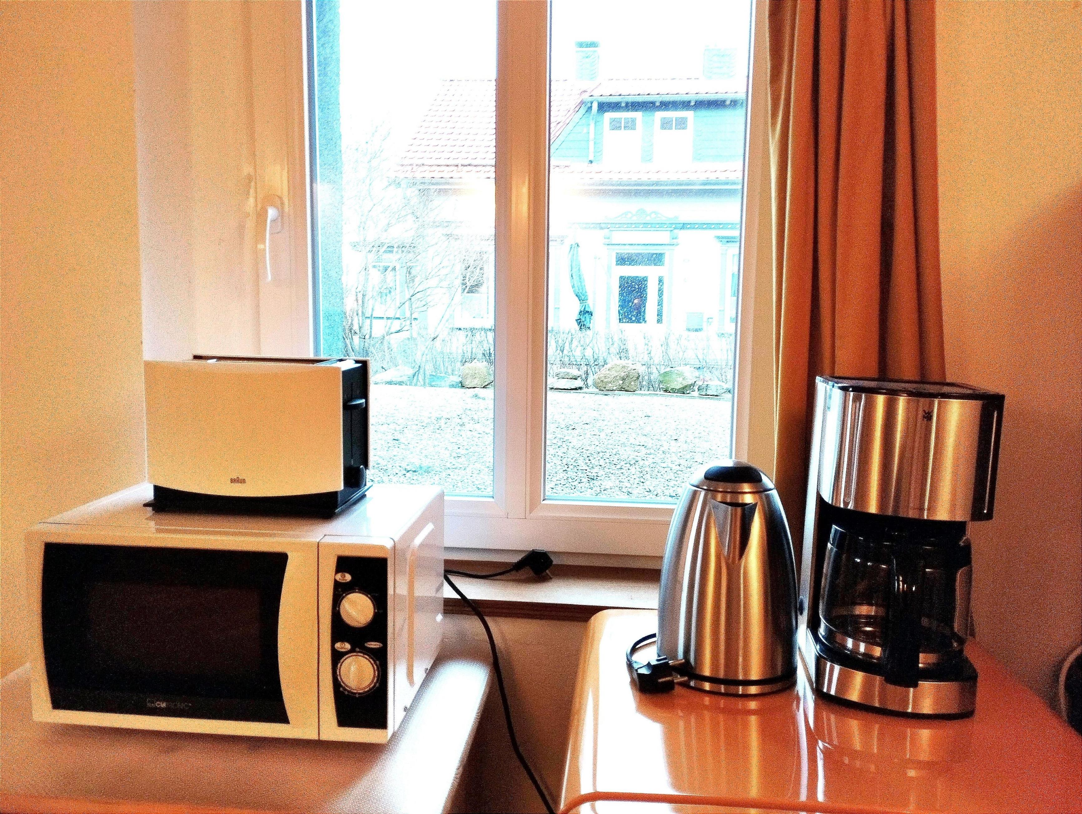 Kaffeemaschine, Wasserkocher, Kaffee- und Teezubehör, Mikrowelle, Toaster