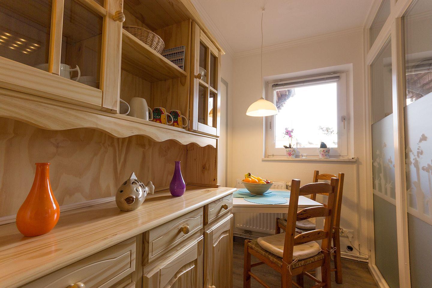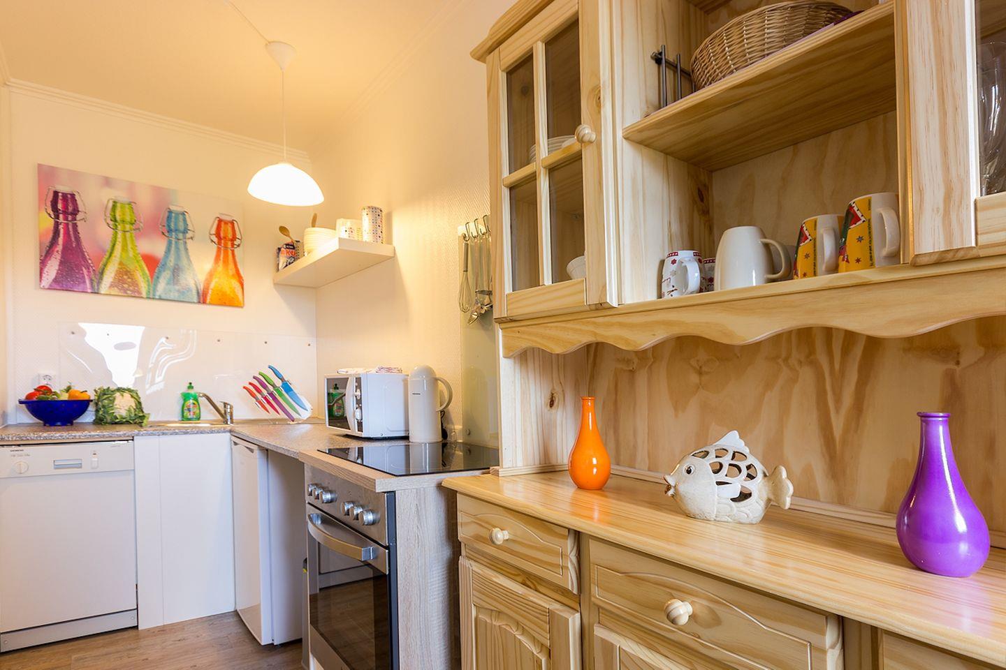 Die kleine Küche ist mit einem Cerankochfeld, Backofen, Spülmaschine, Mikrowelle, Kühlschrank mit Gefrierfach, Kaffeemaschine, Wasserkocher & Toaster ausgestattet. Selbstverständlich sind ausreichend Geschirr sowie die üblichen Utensilien einer Küche vorhanden. Ein Esstisch bietet ausreichend Platz.