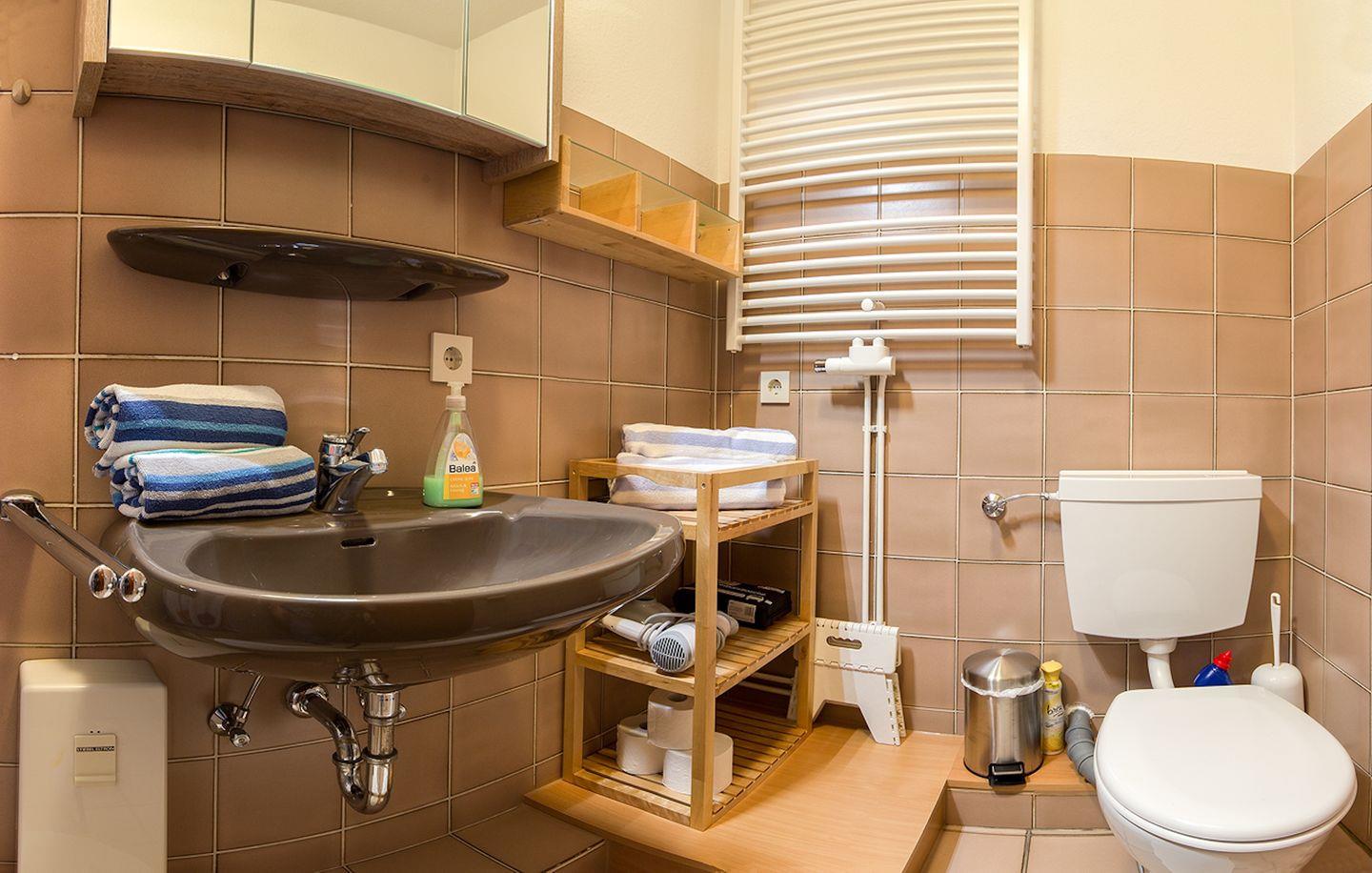 Das Duschbad/WC verfügt über ausreichend Ablageflächen und einen Handtuchtrockner.