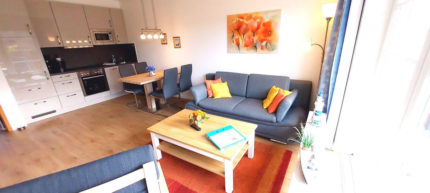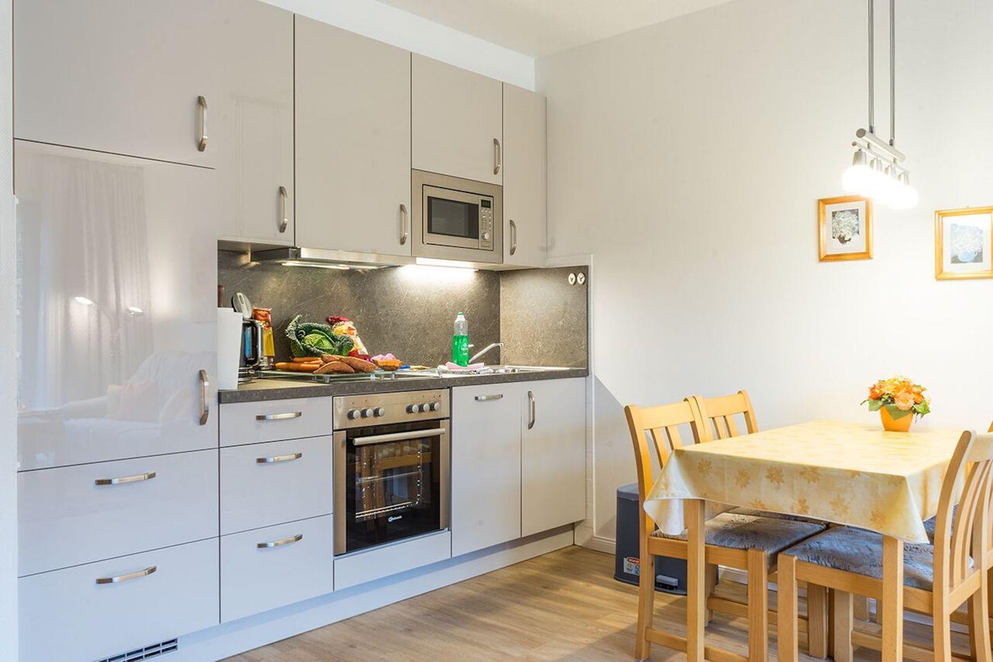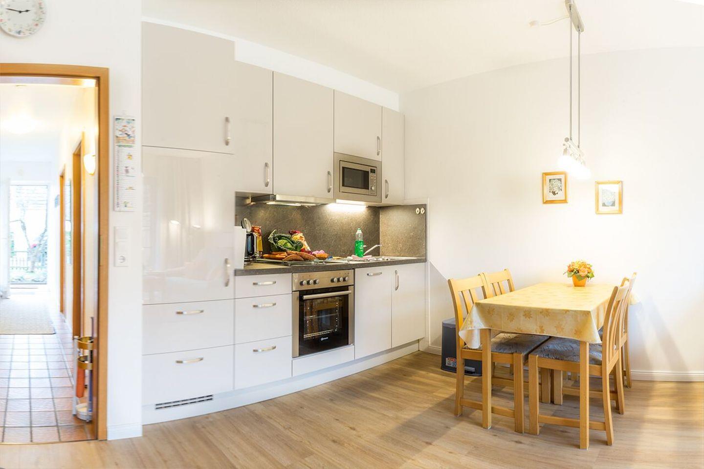 Bestandteil des Wohnraums ist die moderne Einbauküche mit Spülmaschine, Cerankochfeld, Backofen, Kühlschrank & Mikrowelle. Kaffeemaschine, Wasserkocher, Toaster und alles weitere Küchenzubehör wie Geschirr, Besteck, Töpfe und Pfannen sind neuwertig und ausreichend vorhanden.