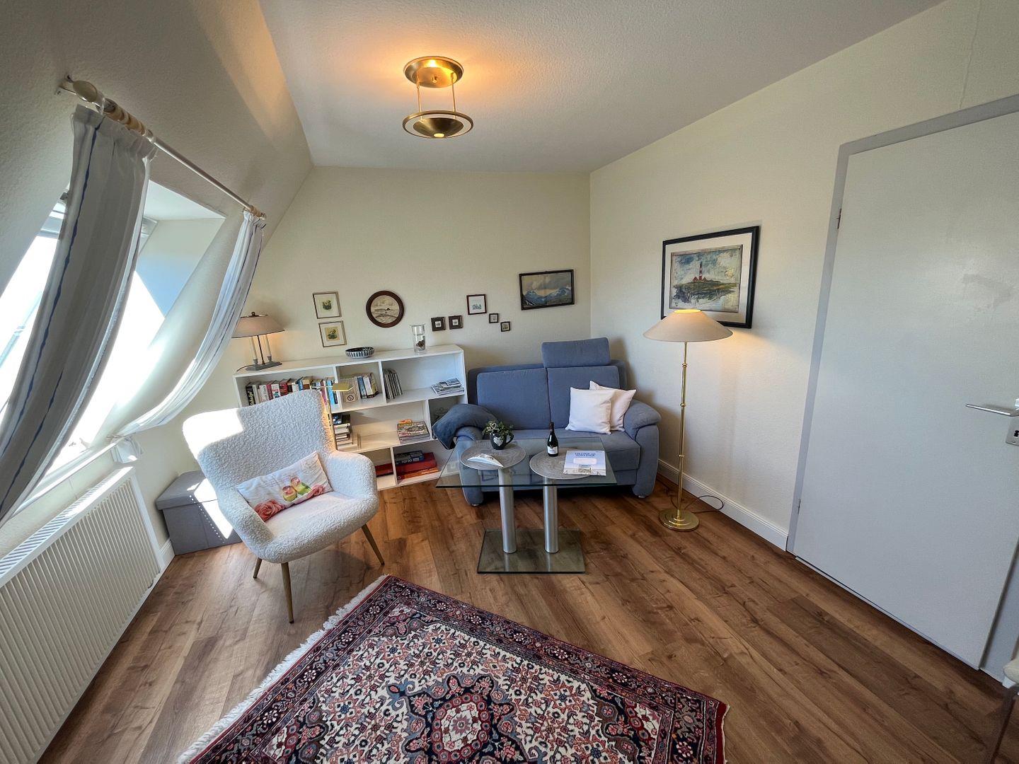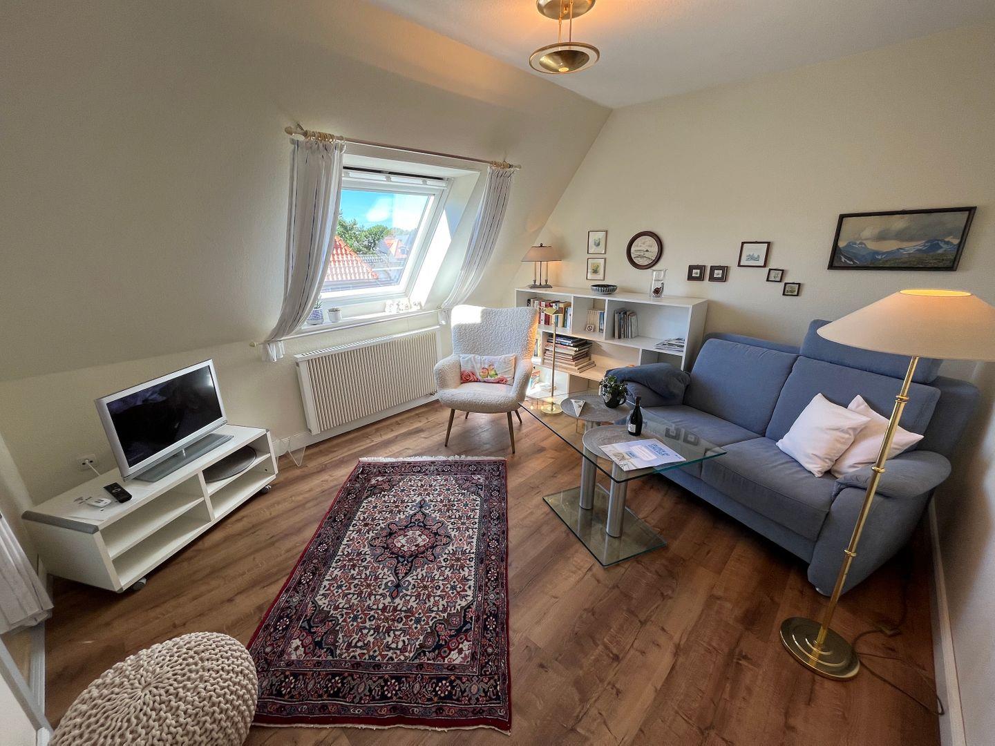 Das Wohnzimmer verfügt über eine Couch, einen Sessel sowie über einen Buffetschrank. Der Boden ist mit Laminat ausgelegt. Ein Farb-Sat-TV sowie eine Mini-Musikanlage sind vorhanden.