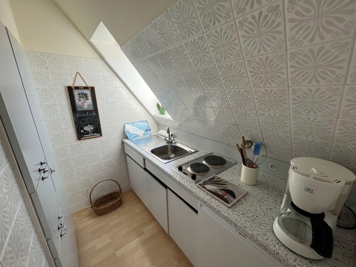 Die kleine zweckmäßige Küche ist mit einem 2-Plattenkochfeld, Mini-Backofen, Wasserkocher, Kaffeemaschine, Toaster und einem Kühlschrank mit Eisfach ausgestattet. Selbstverständlich sind ausreichend Geschirr sowie die üblichen Utensilien einer Küche vorhanden.