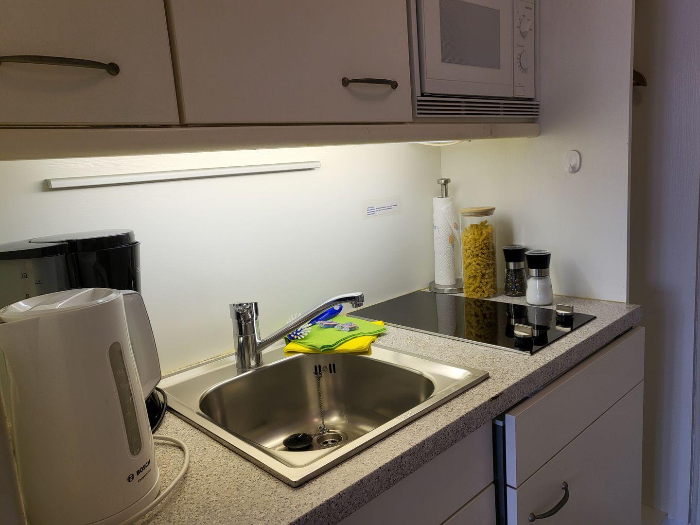Die kompakte, zweckmäßig eingerichtete, 25m² große 1-Zimmer Ferienwohnung liegt in der 1. Etage und bietet 2 Personen Platz für einen wunderbaren Urlaub in St. Peter Ording. Im modern und hell eingerichteten, kombinierten Wohn-Schlafraum findet sich ein platzsparendes Schrankdoppelbett, die Essecke sowie eine gemütliche kompakte Couch und ein Flachbild-TV nebst Blue-Ray-Player und Musikanlage. Kostenfreies W-LAN ist im strandnahen Apartment in Bestlage ebenfalls vorhanden. Die kompakte Pantry-Küche bietet Kühlschrank, Mikrowelle, Wasserkocher und Kaffeemaschine. Ein möblierter Balkon zur Landseite steht zur Verfügung.