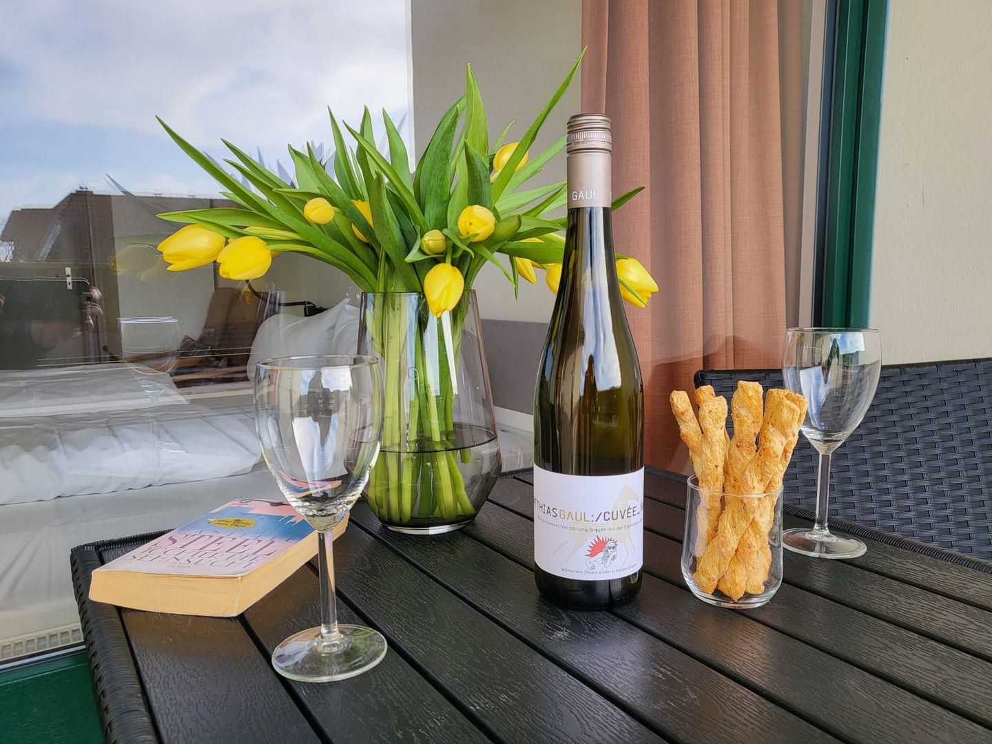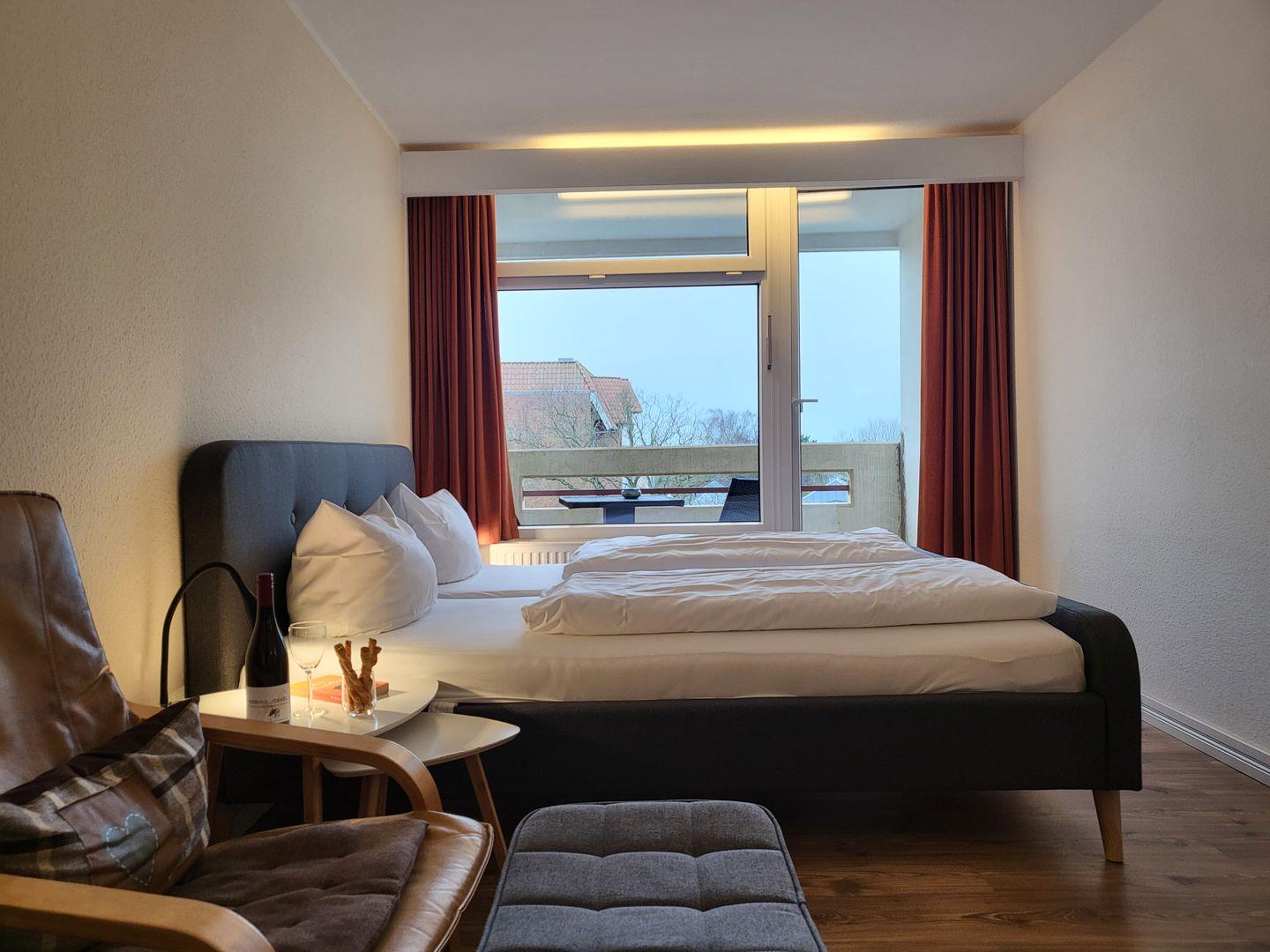 Zentral gelegene 1 Zimmer Ferienwohnung im 2. OG für 2 Personen. Möblierter Balkon mit Blick zur Seeseite. Kombinierter Wohn-Schlafraum mit Doppelbett, 2 Sessel und TV, Esstisch mit Küchenzeile sowie Duschbad mit WC.