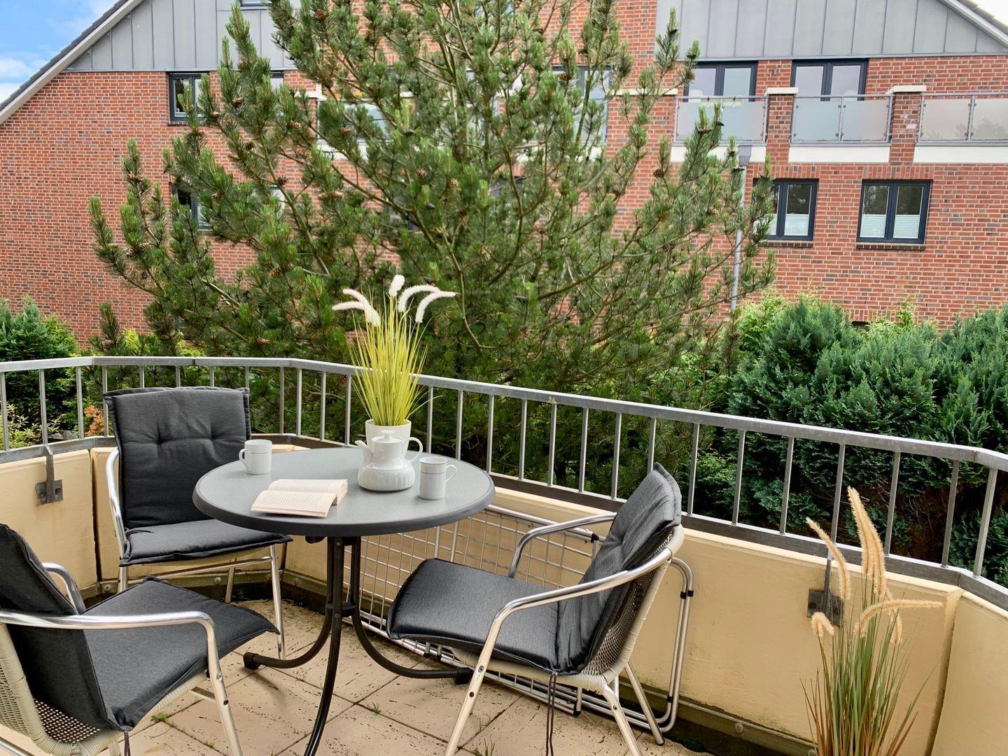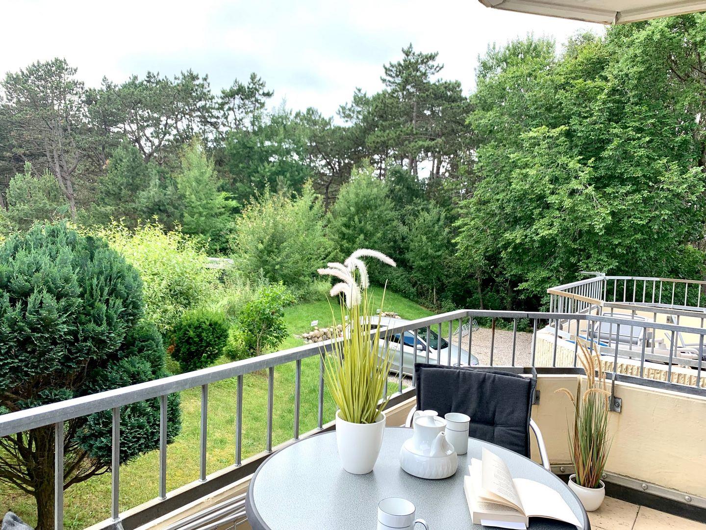Zur Ferienwohnung gehört ein möblierter Balkon, der einen tollen Ausblick Richtung Kurwald und gemütliche Sonnenstunden verspricht.