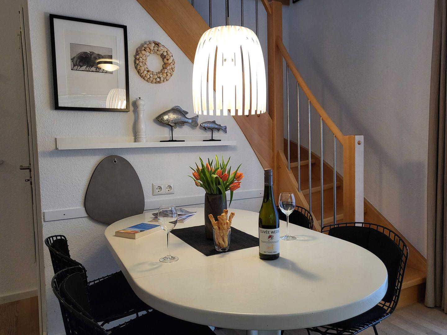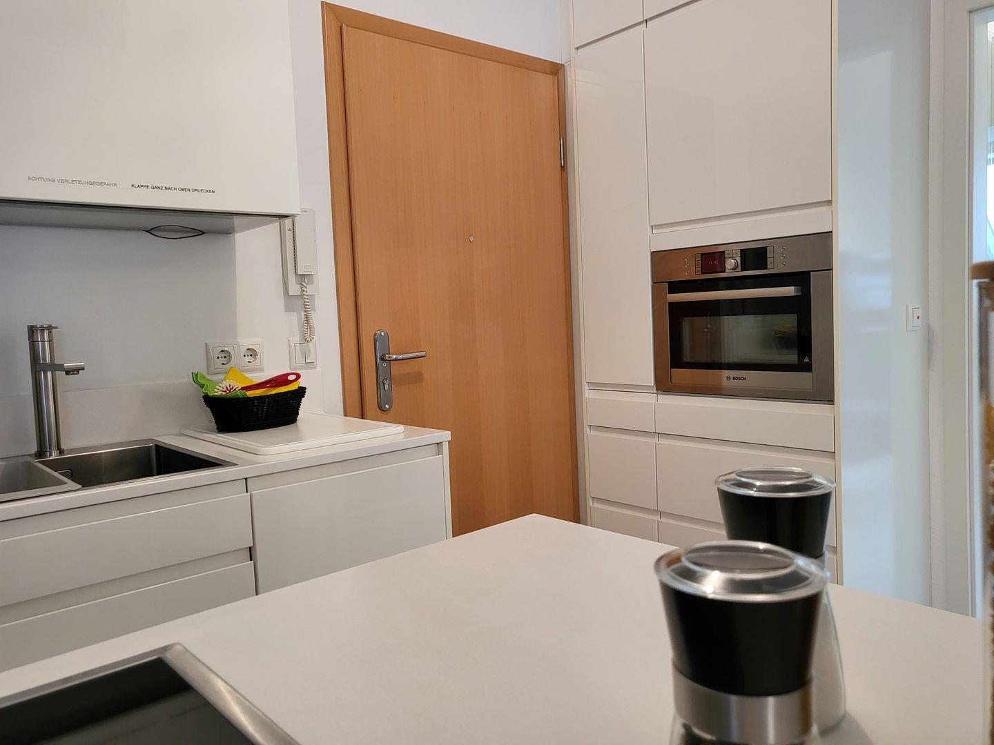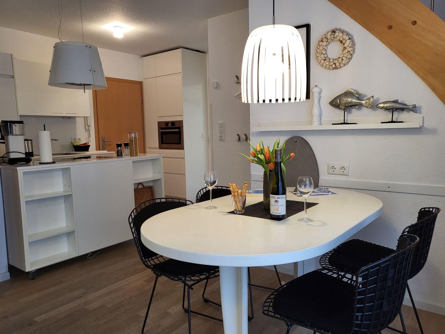 In den Raum integriert liegt die modern und hochwertig ausgestattete Küche. Ein großes Cerankochfeld gehört zusammen mit Backofen, Kühlschrank mit Gefrierfach sowie Geschirrspüler und Kaffeemaschine zur Ausstattung. Zur Ferienwohnung gehört ein helles Duschbad mit WC, im Badezimmer steht ein Waschtrockner bereit. Ein Kinderreisebett und ein Hochstuhl stehen zur Verfügung.