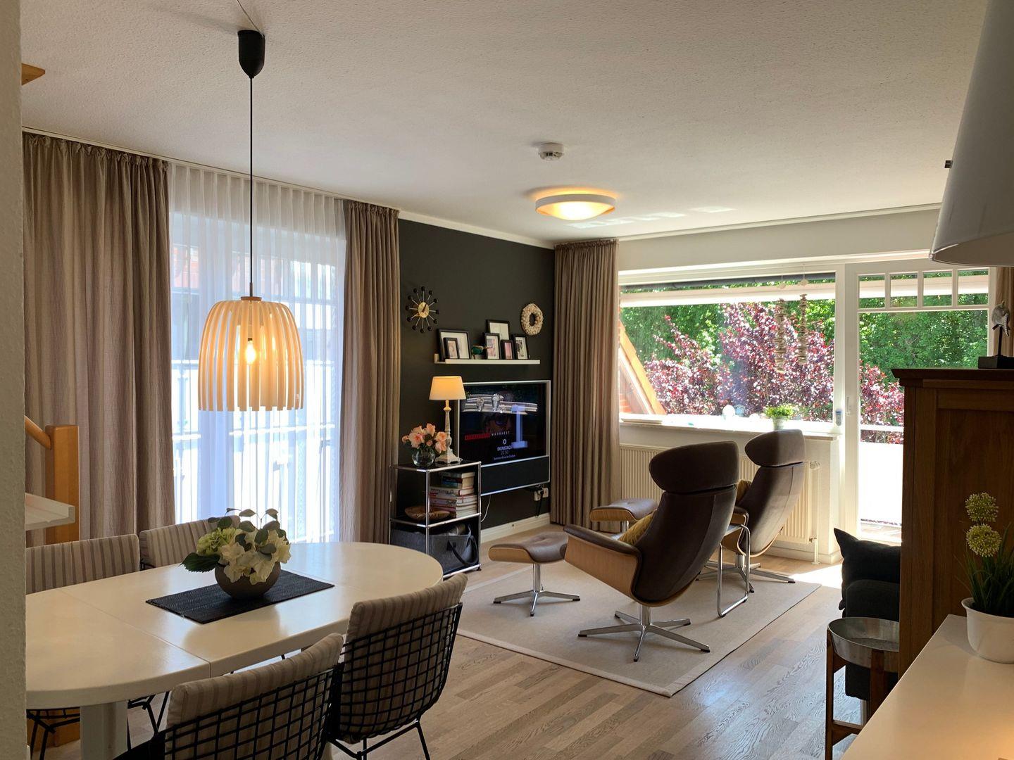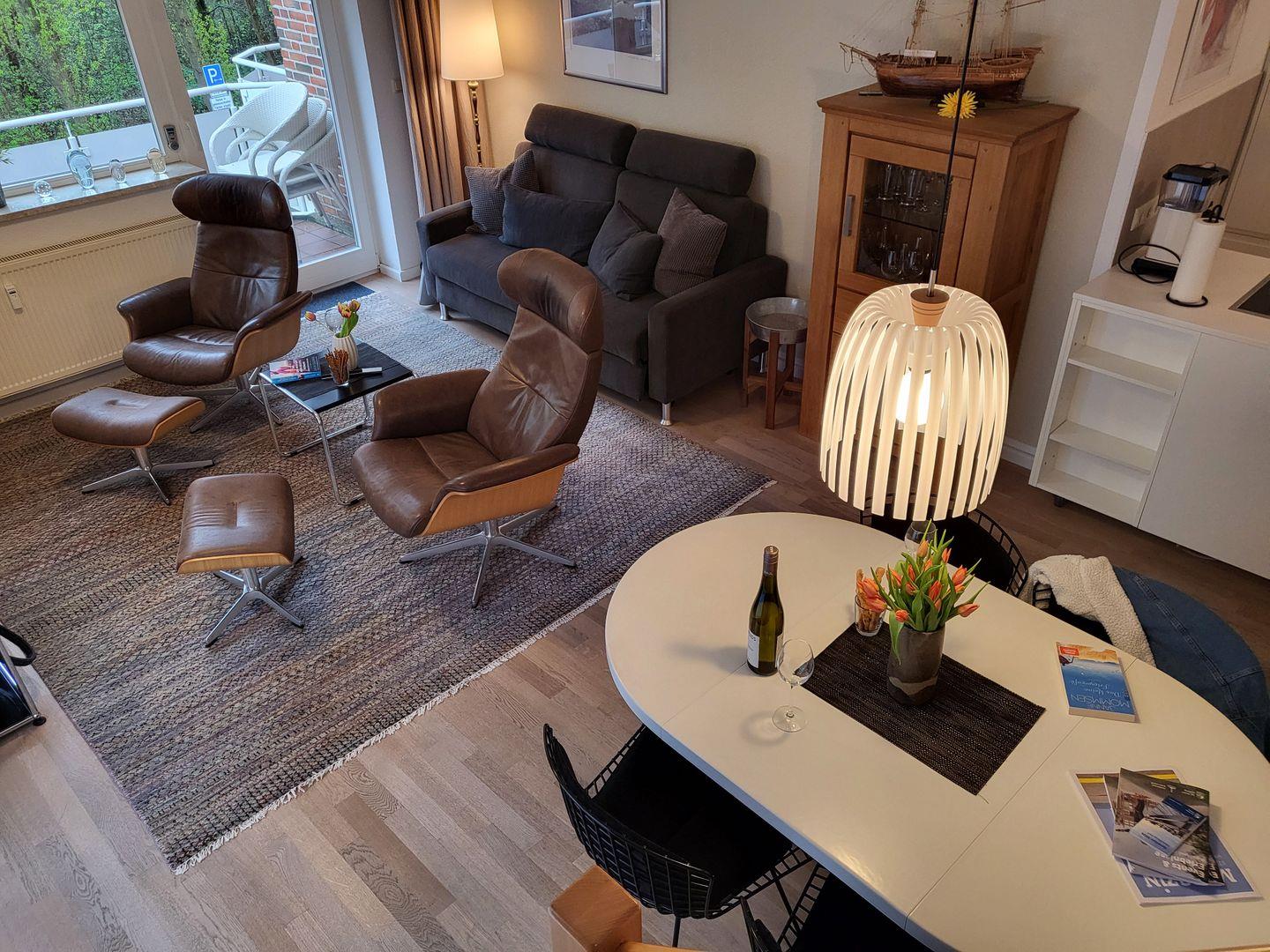 3 Zimmer Ferienwohnung im 2. OG mit 2 Balkonen. Wohnraum mit gemütler Couchgarnitur, Esstisch,