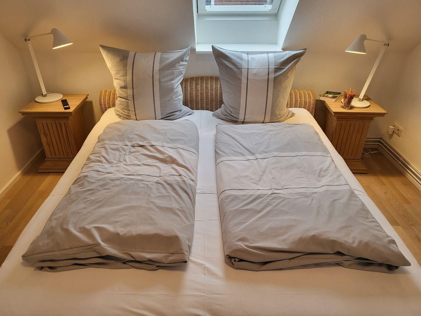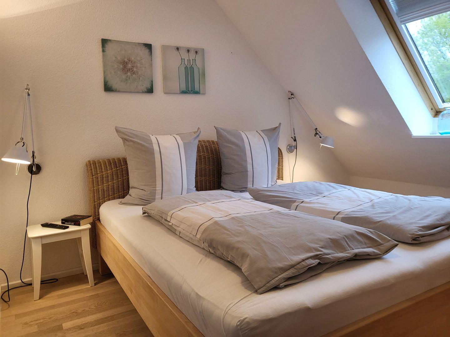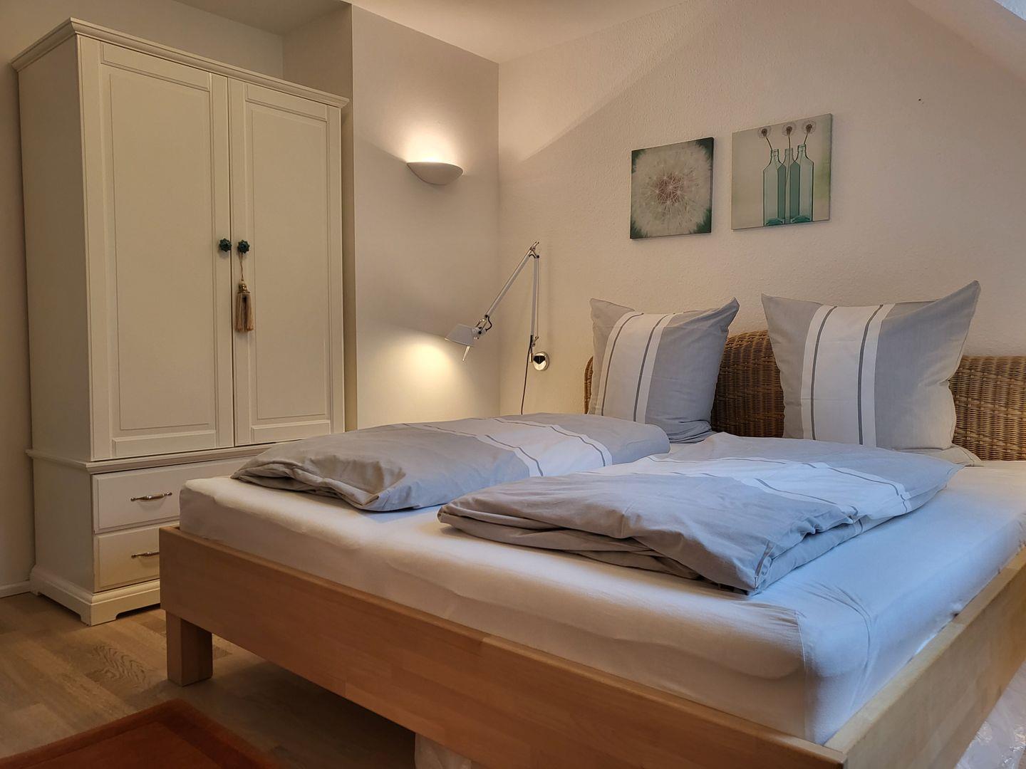 Eine geschwungene Treppe führt ins Dachgeschoss, in dem sich das zweite Schlafzimmer der Ferienwohnung befindet. Zur Ausstattung gehören ein großes 180x200cm Doppelbett, ein geräumiger Kleiderschrank sowie ein Flachbild-TV.