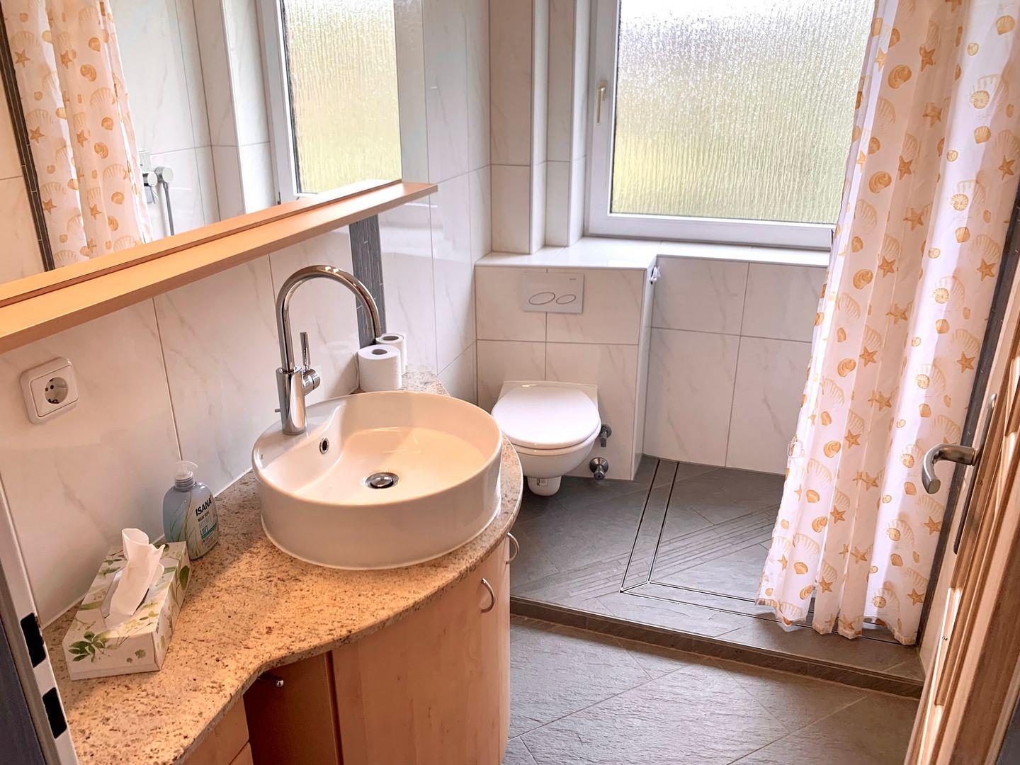 Das einladend eingerichtete Wohnzimmer ist ausgestattet mit einer komfortablen Sitzecke, bestehend aus Sofa, Sessel und einem Tisch, der als Steuerrad schon die Weltmeere bereist hat. Für Unterhaltung sorgen Flachbild-TV, Radio sowie Brettspiele für gemütliche Abende und eine Auswahl an Büchern. Die angrenzende Küchenzeile ist mit einer hüfthohen Trennwand vom Wohnraum separiert. Sie ist sehr gut ausgestattet und verfügt unter anderem über Cerankochfeld und Backofen sowie Kühlschrank, Geschirrspüler und Kaffeemaschine. Das große Schlafzimmer der Ferienwohnung ist ausgestattet mit einem 180x200cm Doppelbett und einem geräumigen Kleiderschrank. Zur Ferienwohnung gehören Duschbad und WC, die Regendusche ist bodengleich angelegt.