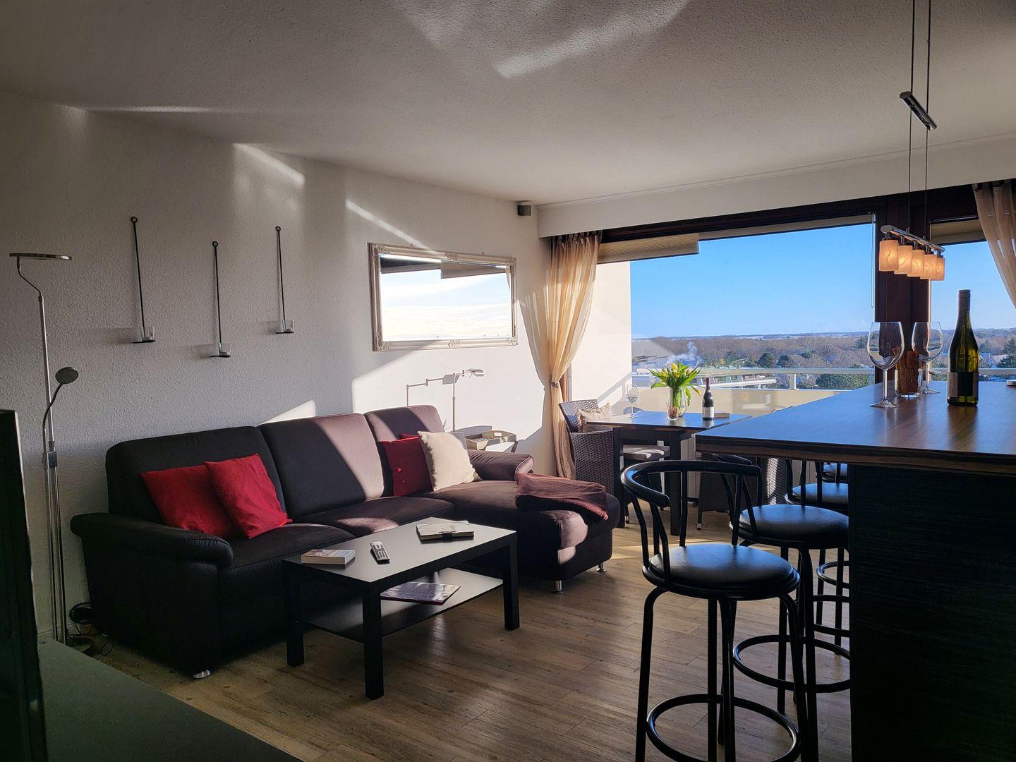 Moderne 3-Zimmer Ferienwohnung in 7. Etage mit Balkon und direktem Seeblick.