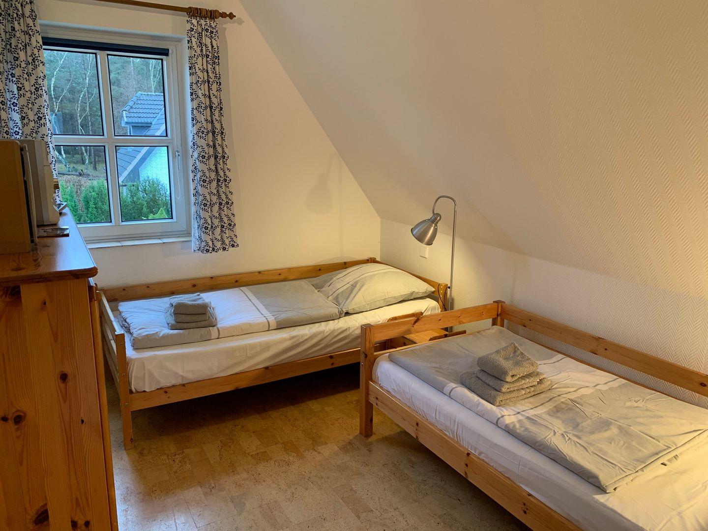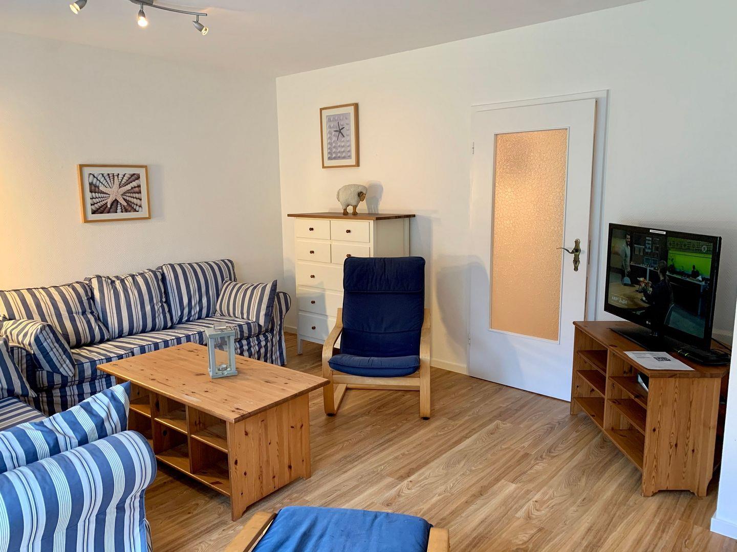 Das große Wohnzimmer des Ferienhauses wirkt hell und einladend, hier gehört eine urgemütliche Sitzgruppe aus zwei gemütlichen Sofas und 2 komfortablen Schwingsesseln zur Ausstattung. Für die multimediale Unterhaltung im maritim eingerichteten Raum sorgen Flachbild-TV und kostenfreies W-LAN, am Esstisch ist Platz für die ganze Familie. Die zum Wohnzimmer hin offene, moderne Küche ist sehr gut ausgestattet. Hier gehören unter anderem Cerankochfeld und Backofen, ein Kühlschrank sowie Mikrowelle, Geschirrspüler und Kaffeemaschine zur Ausstattung. Ein Kühlschrank mit Gefrierfach ist ebenfalls vorhanden. Am Tresen sind zwei separate Sitzplätze vorhanden. Im Obergeschoss des Ferienhauses befinden sich 3 Schlafzimmer. Eines ist ausgestattet mit 160x200cm Doppelbett und einem Kleiderschrank, ein weiteres verfügt über ein 160x200cm Doppelbett sowie ein Einzelbett, einen Flachbild-TV und einen Kleiderschrank. Im dritten Schlafzimmer stehen zwei Einzelbetten sowie ein Kleiderschrank zur Verfügung.
